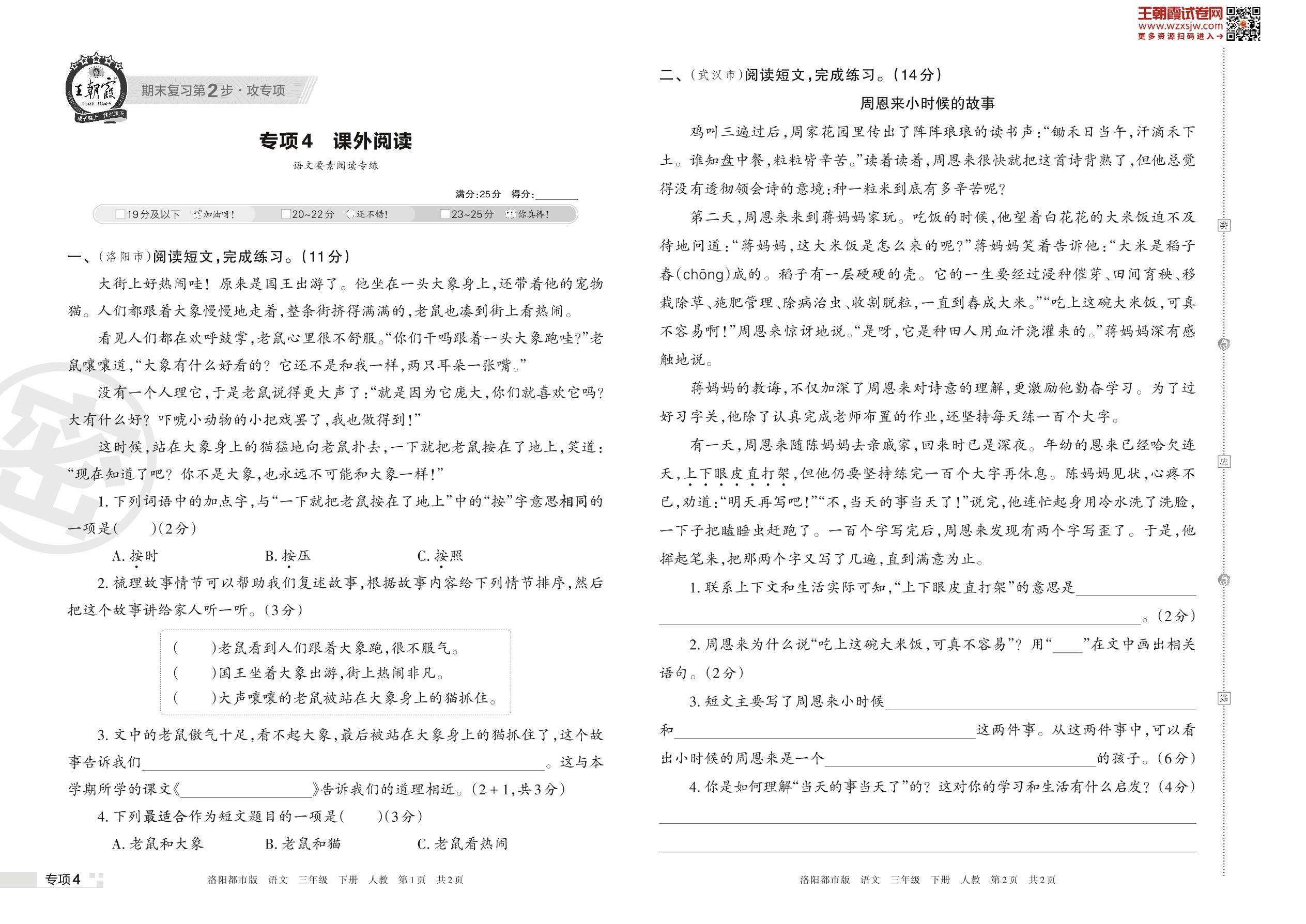 王朝霞期末专项卷——课外阅读三年级下册语文(人教版)_R230425154340739【4】