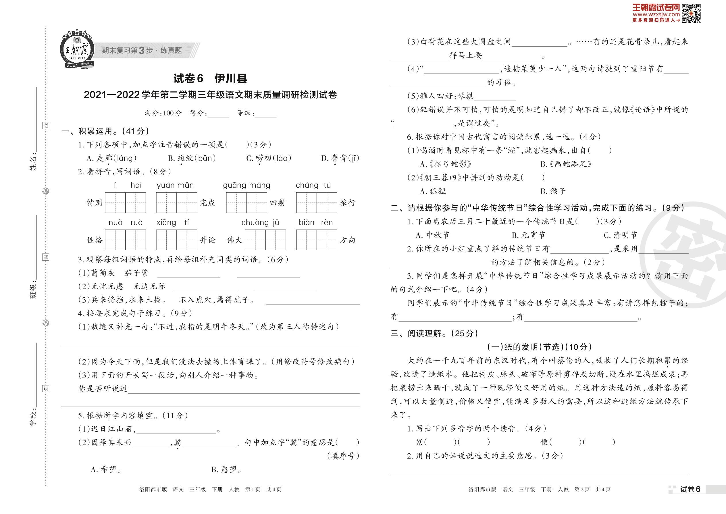 伊川县2021—2022学年第二学期三年级语文期末质量调研检测试卷(人教版)【6】