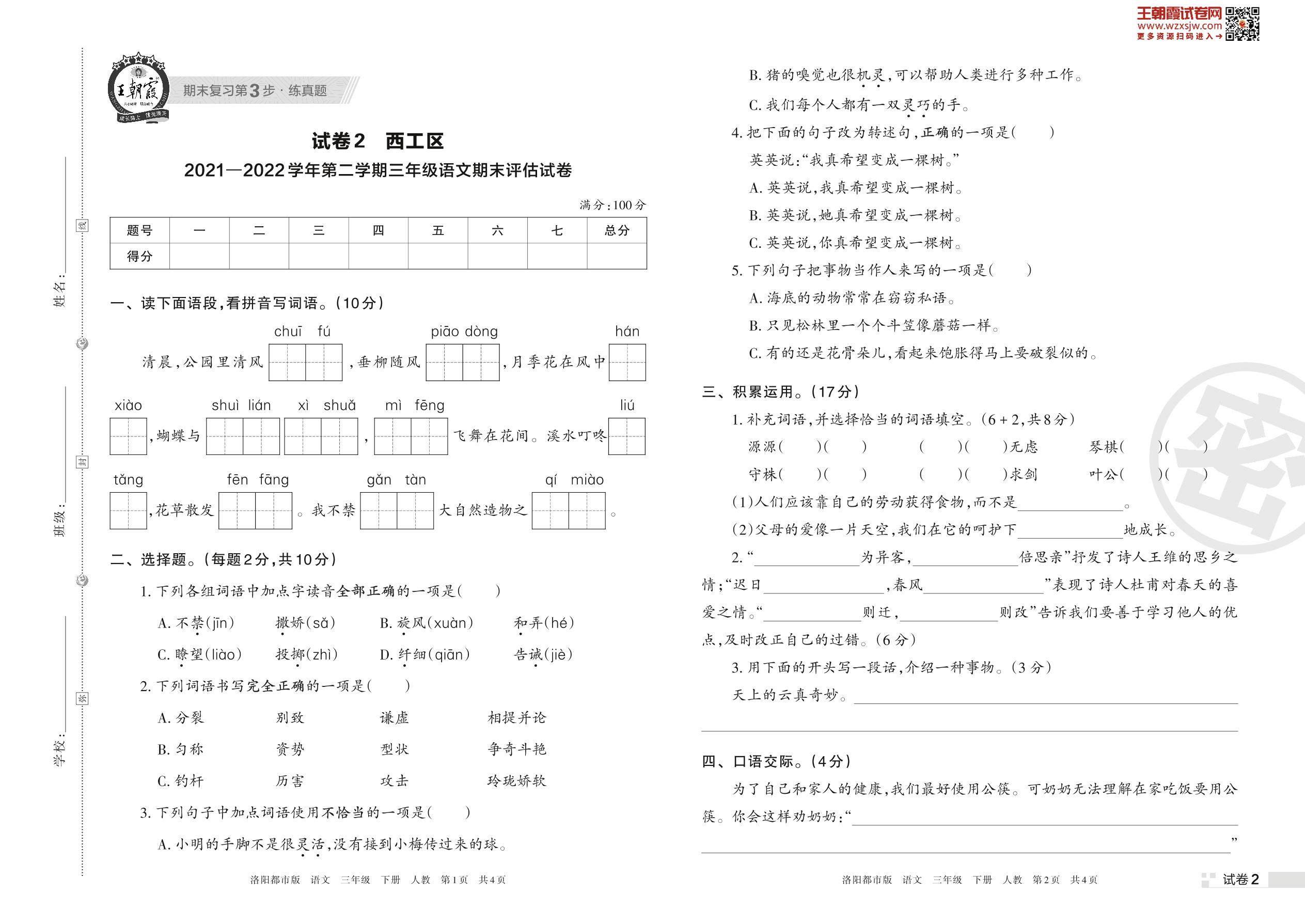 西工区2021—2022学年第二学期三年级语文期末评估试卷(人教版)【2】