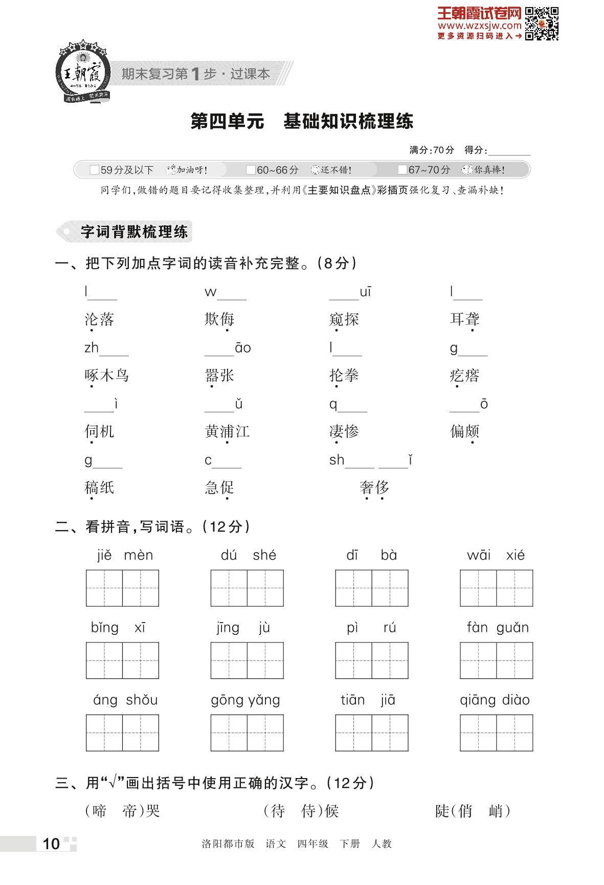 王朝霞期末过课本——第四单元 基础知识梳理练四年级下册语文(人教版)_R230425154857340
