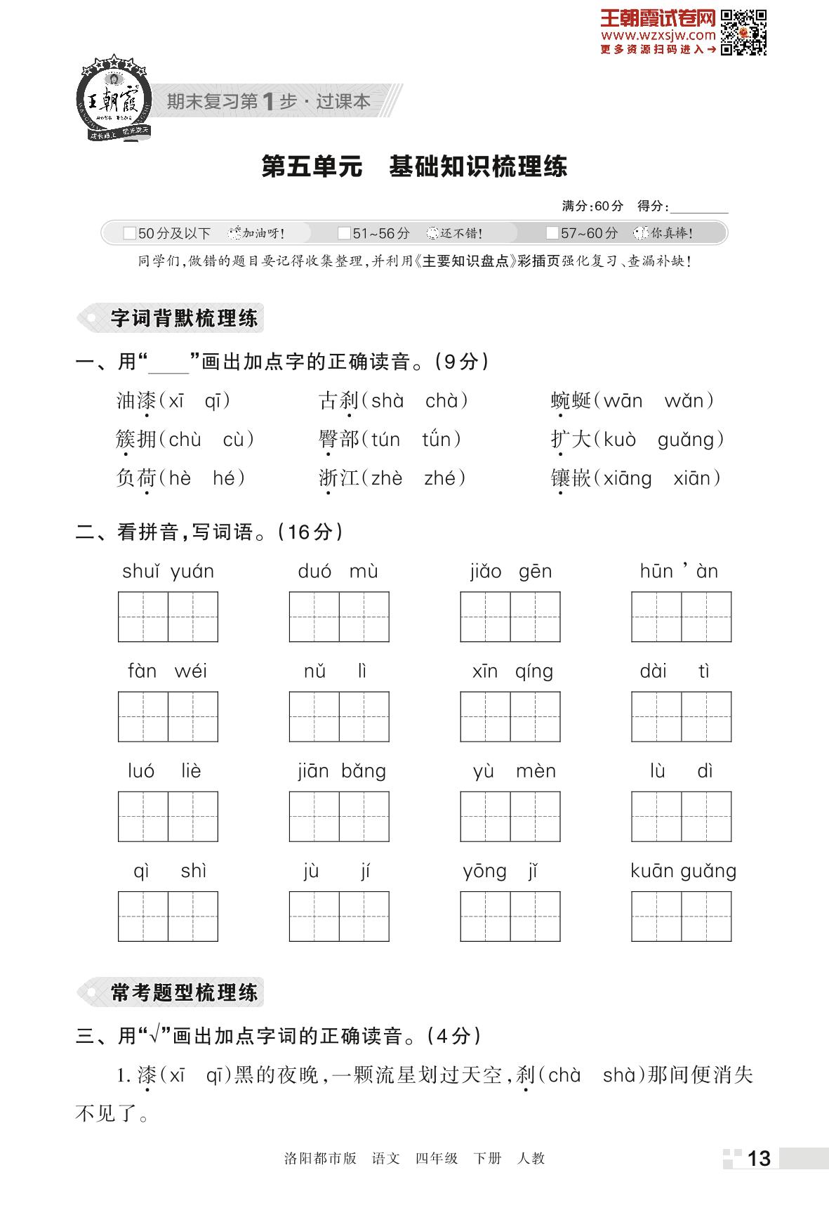 王朝霞期末过课本——第五单元 基础知识梳理练四年级下册语文(人教版)_R230425154857702