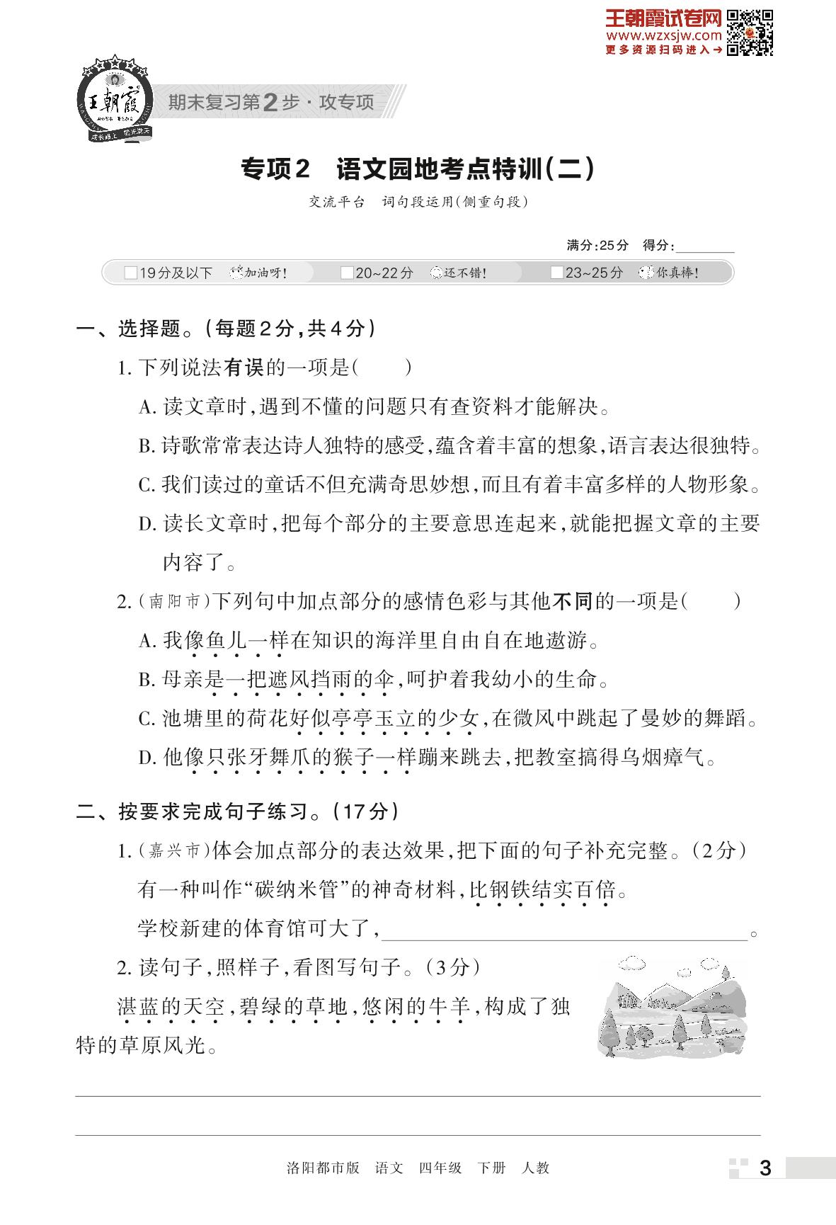 王朝霞期末专项卷——语文园地考点特训(二)四年级下册语文(人教版)_R230425154858516【2】
