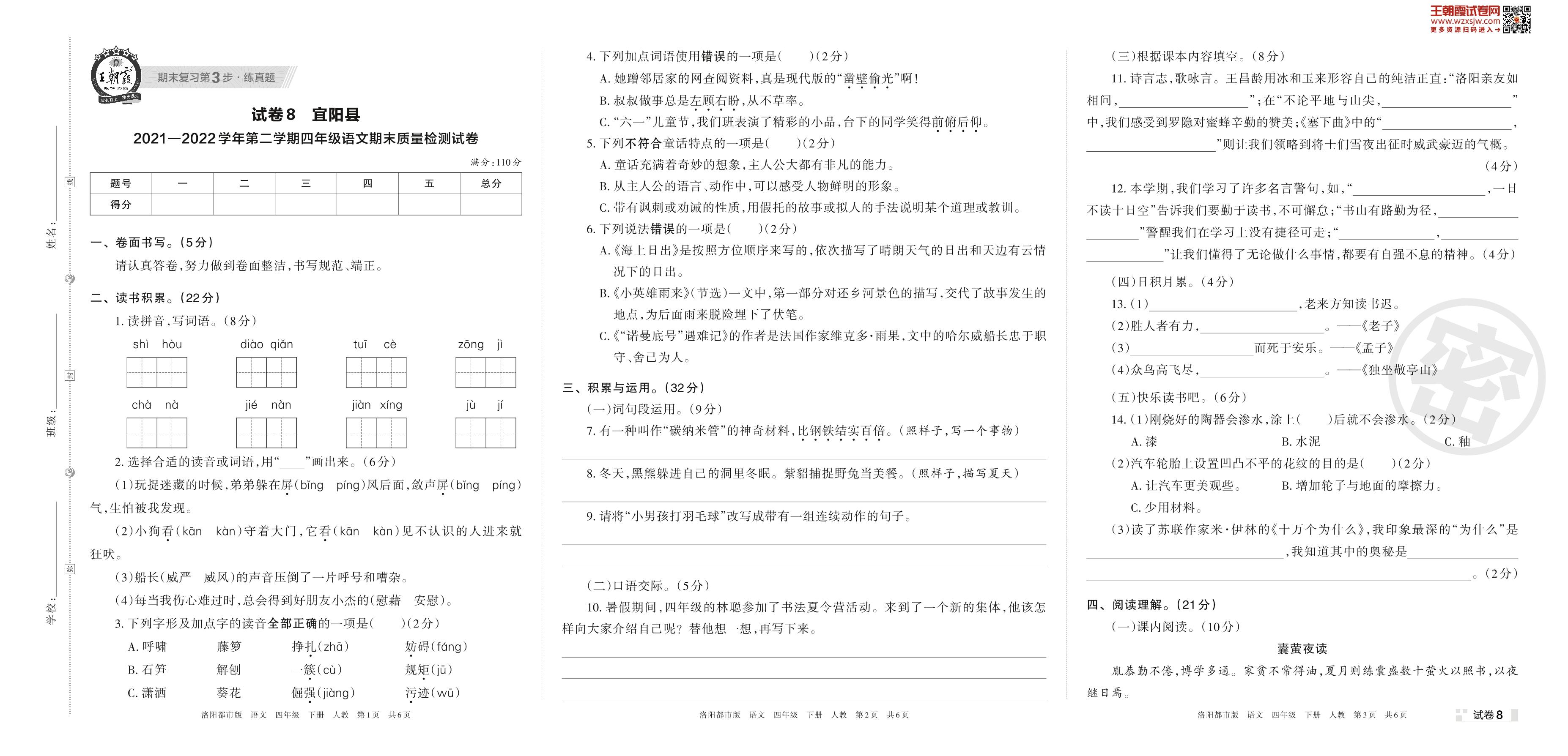 宜阳县2021—2022学年第二学期四年级语文期末质量检测试卷(人教版)【8】