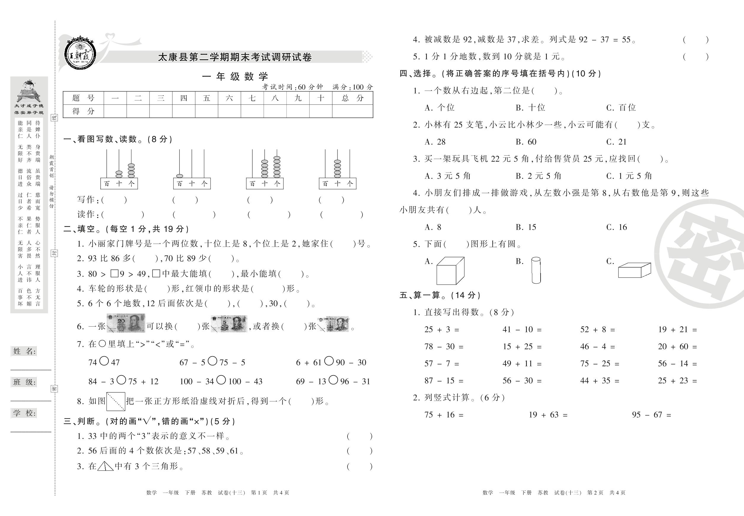 一年级数学苏教版下册期末卷