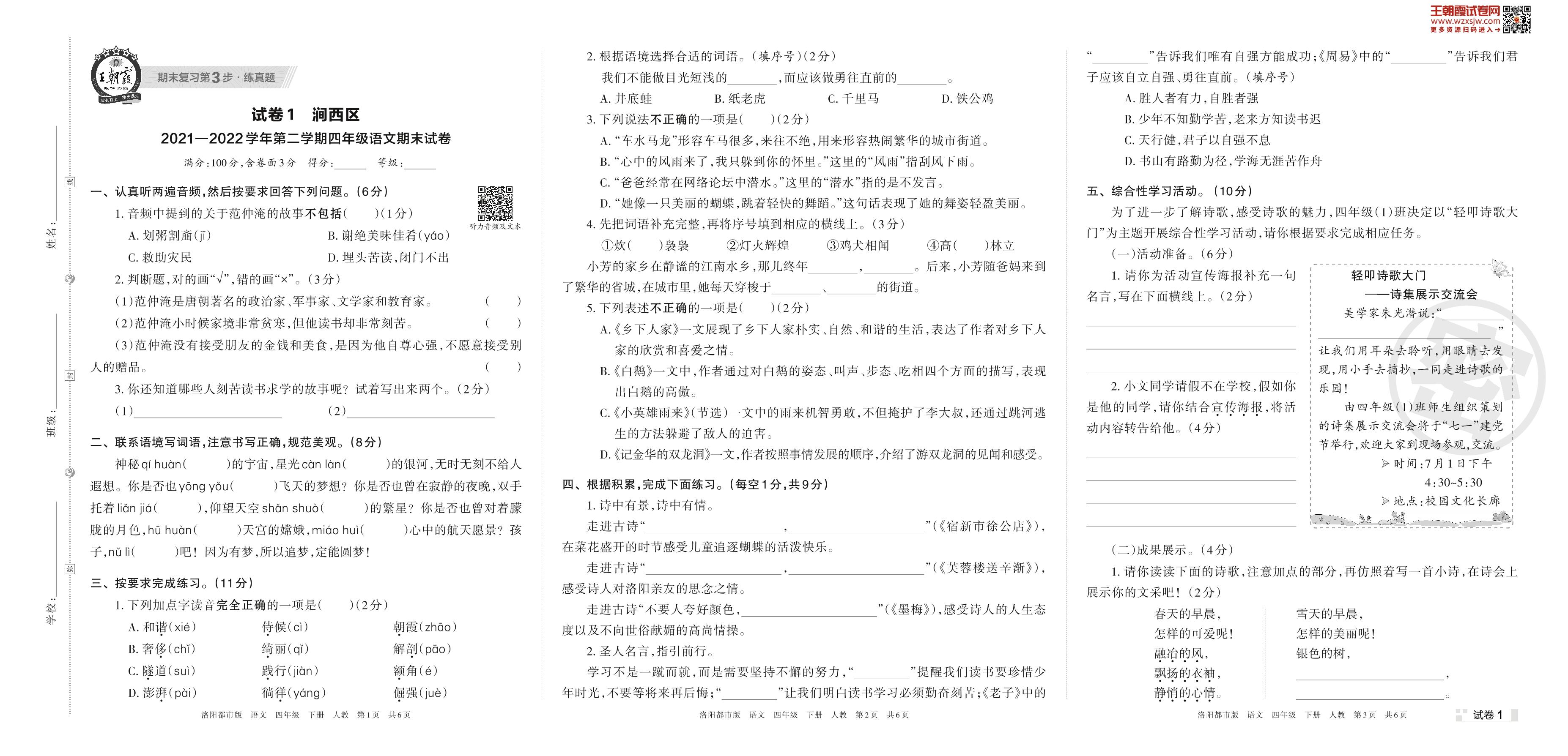 涧西区2021—2022学年第二学期四年级语文期末试卷(人教版)【1】