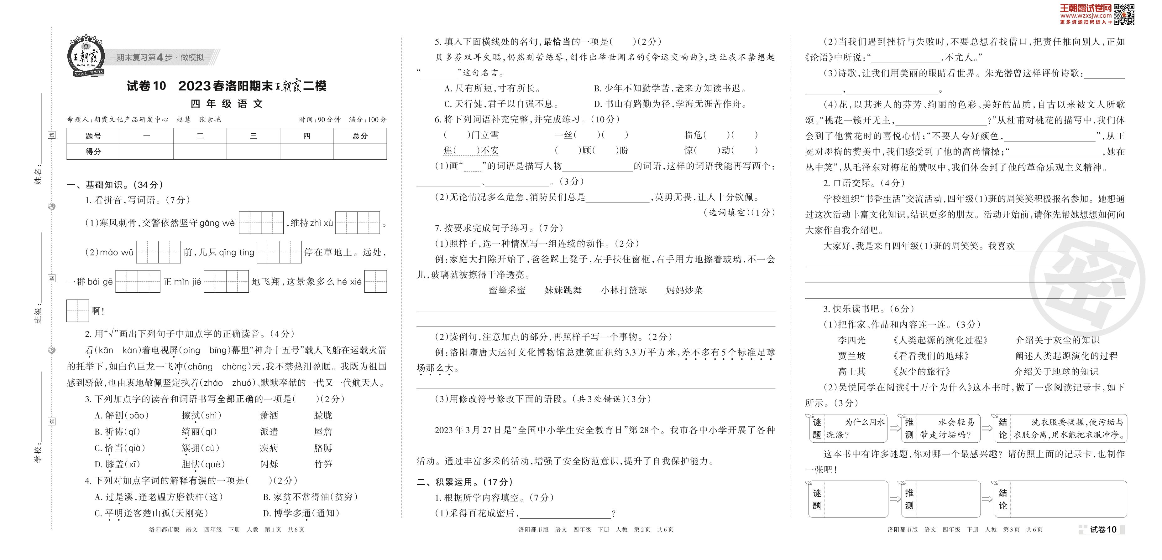 王朝霞期末模拟卷四年级下册语文(人教版)【10】