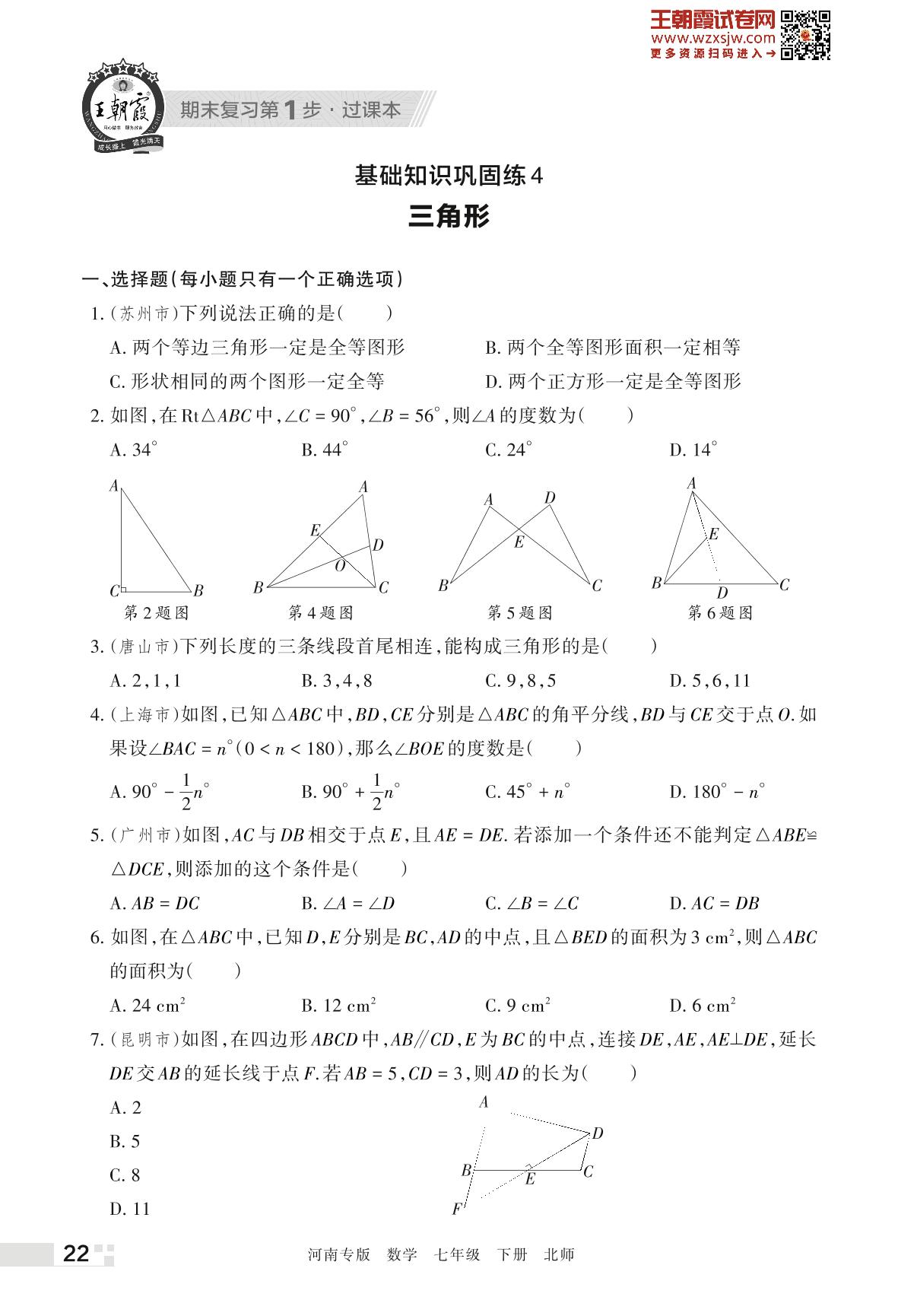 王朝霞期末过课本——基础知识巩固练4 三角形七年级下册数学(北师版)_R230425154928110
