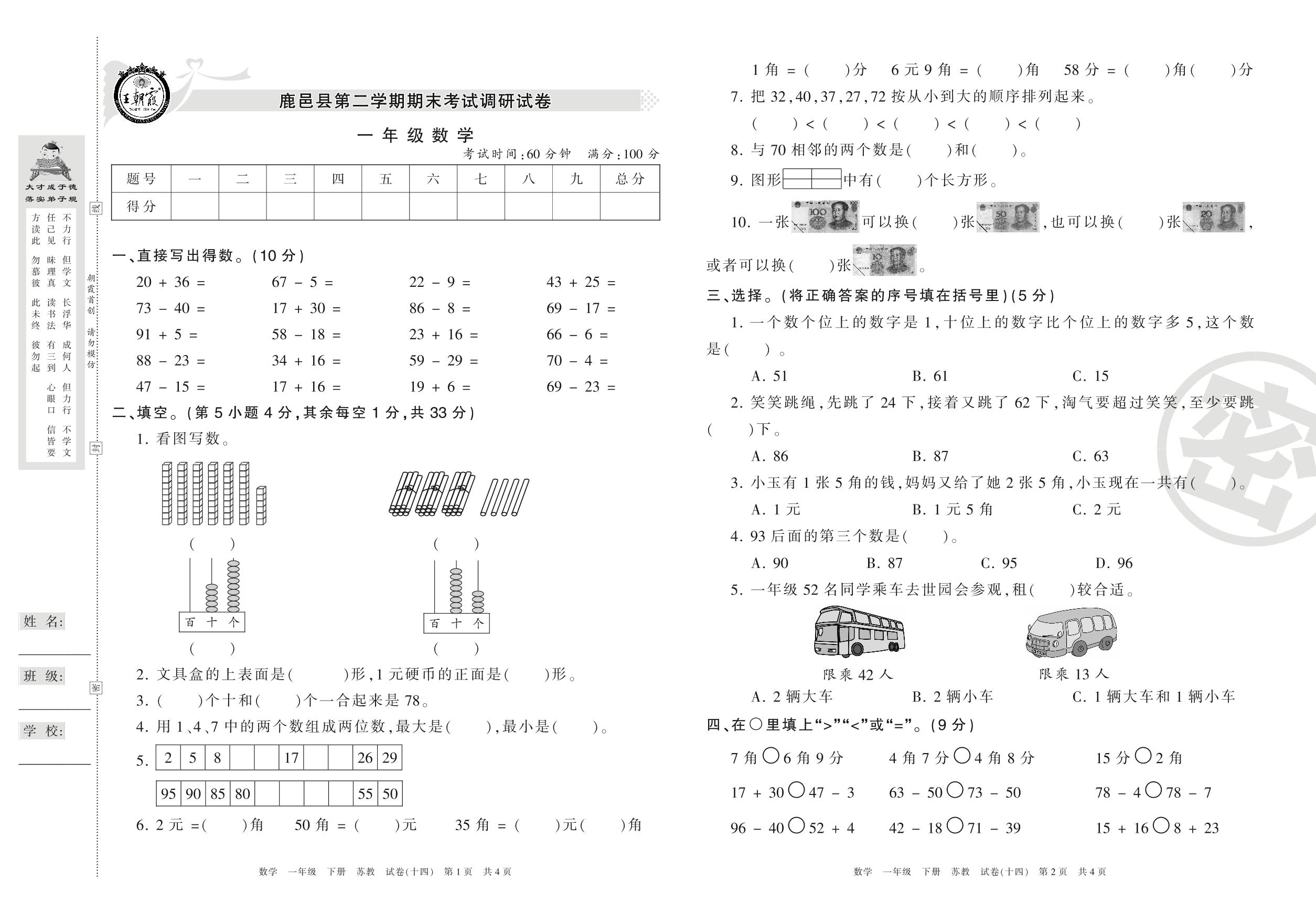 2015-2016学年第二学期周口市鹿邑县一年级数学试卷(苏教版)【14】