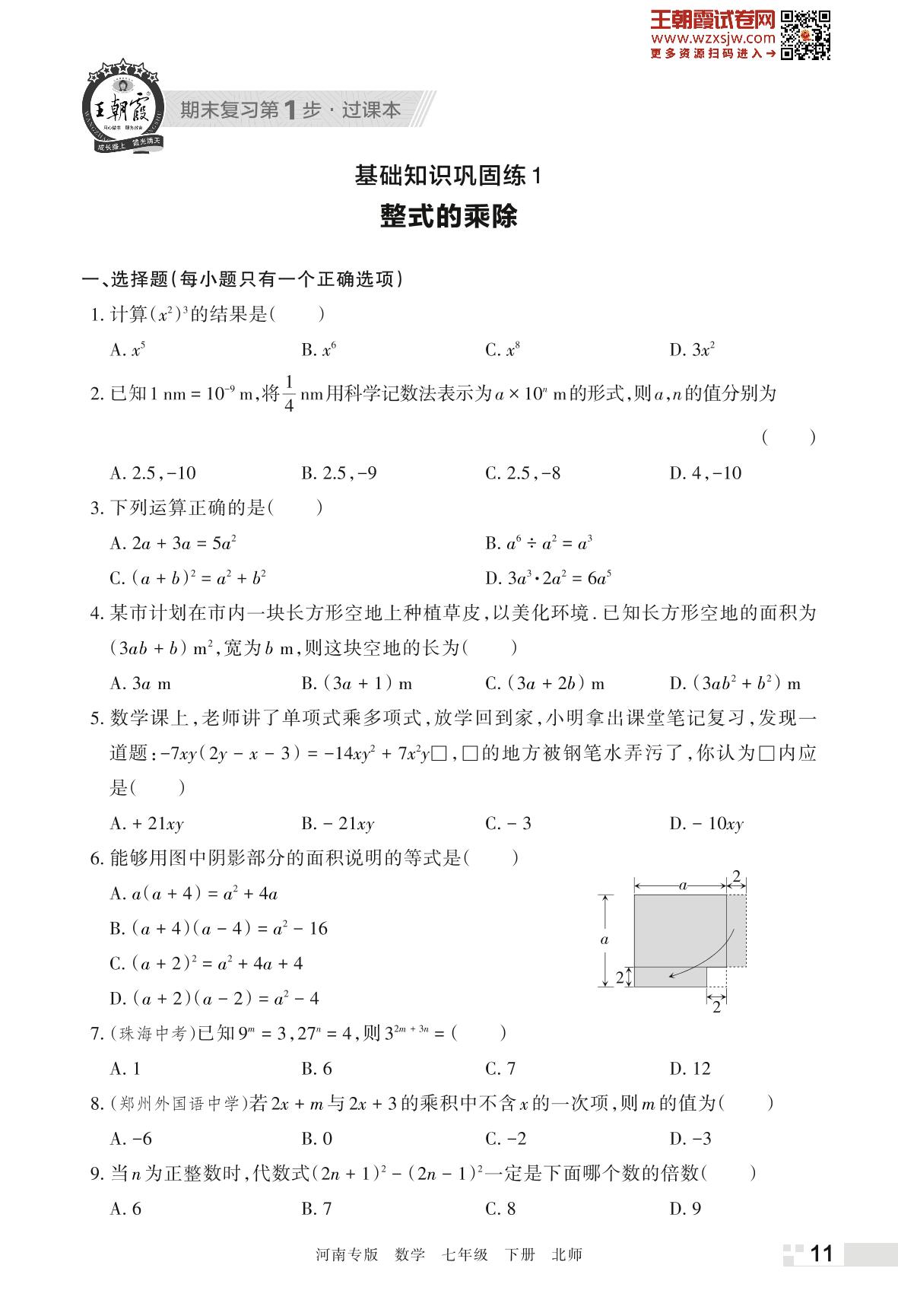 王朝霞期末过课本——基础知识巩固练1 整式的乘除七年级下册数学(北师版)_R230425154928506