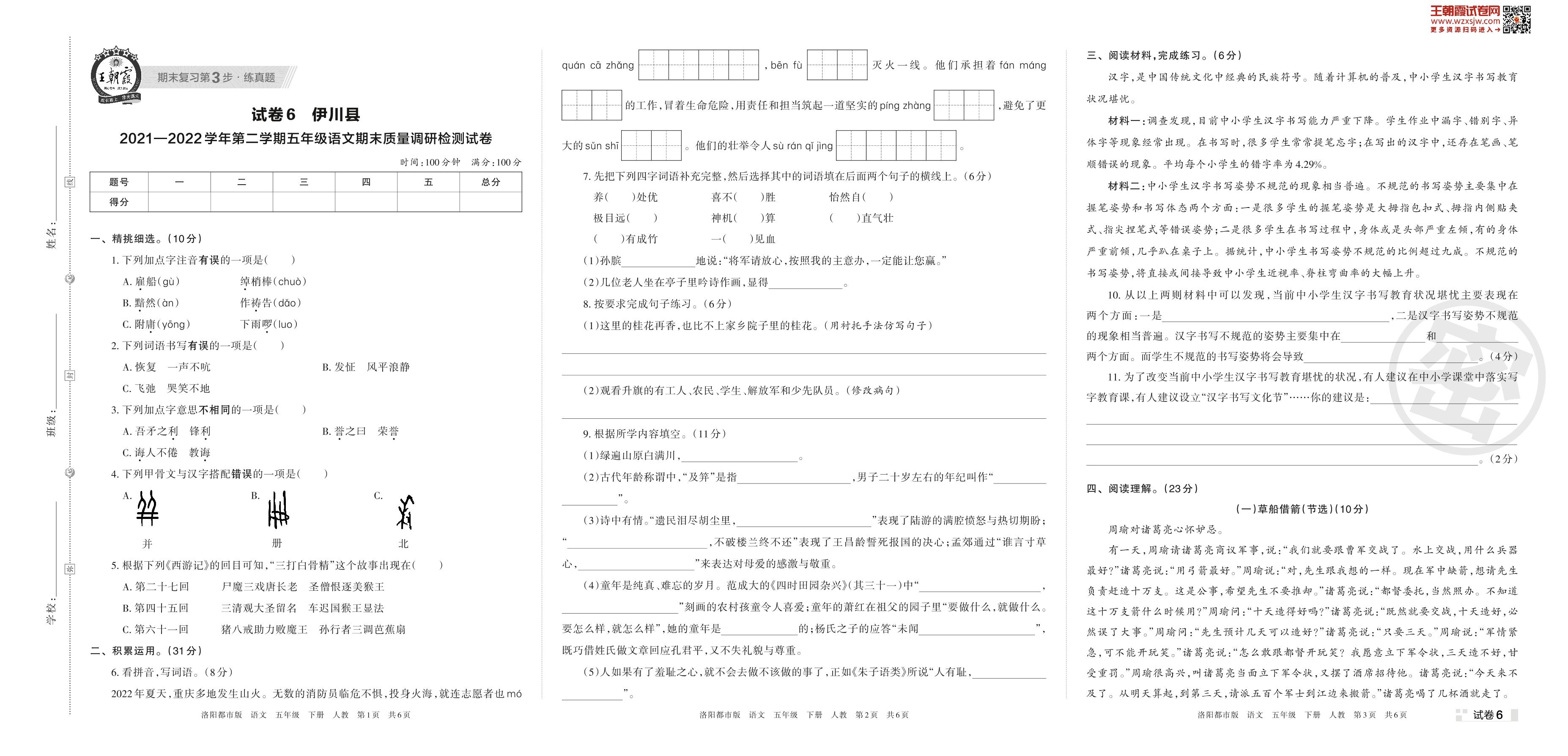 伊川县2021—2022学年第二学期五年级语文期末质量调研检测试卷(人教版)【6】