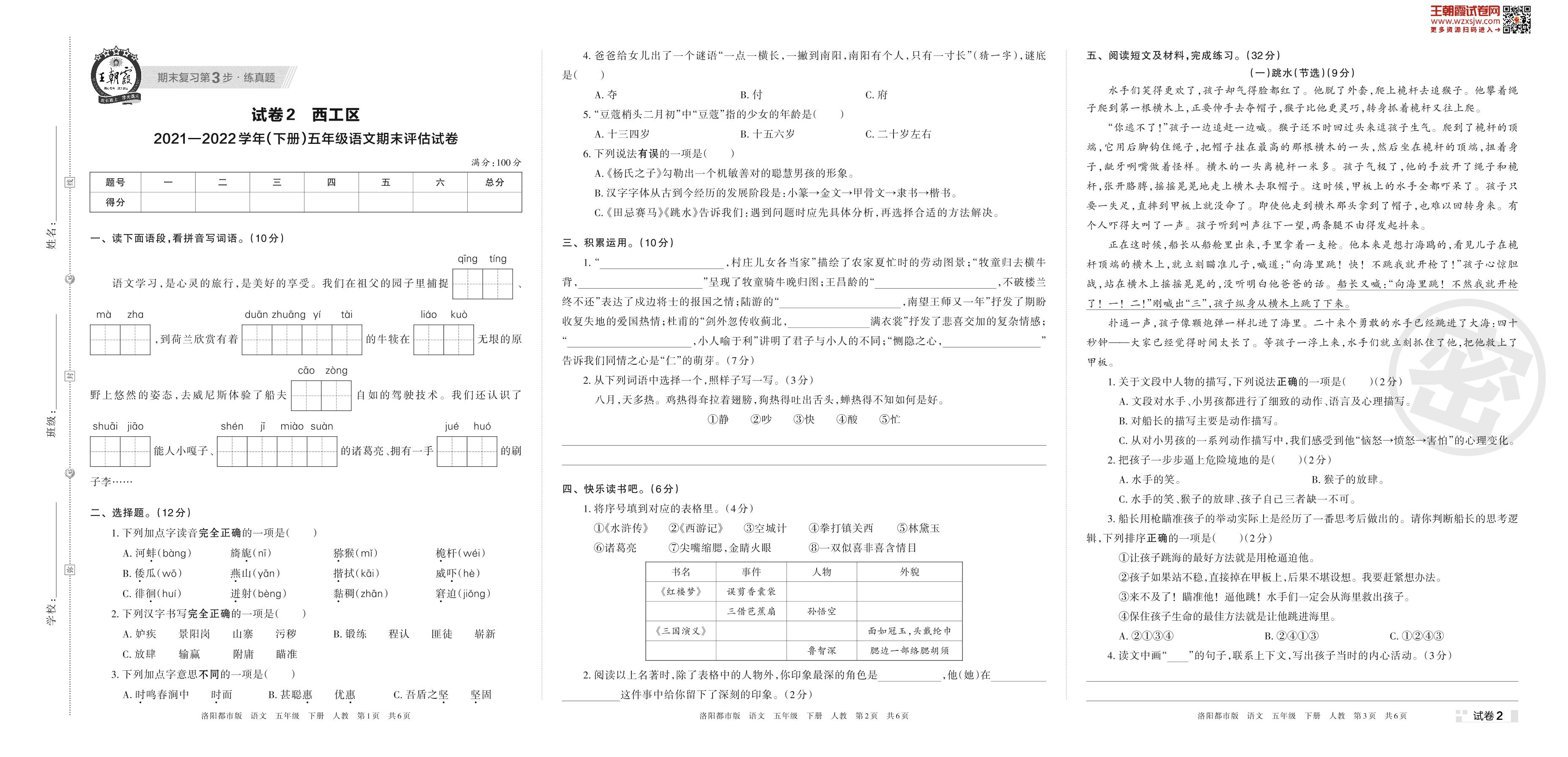 西工区2021—2022学年(下册)五年级语文期末评估试卷(人教版)【2】