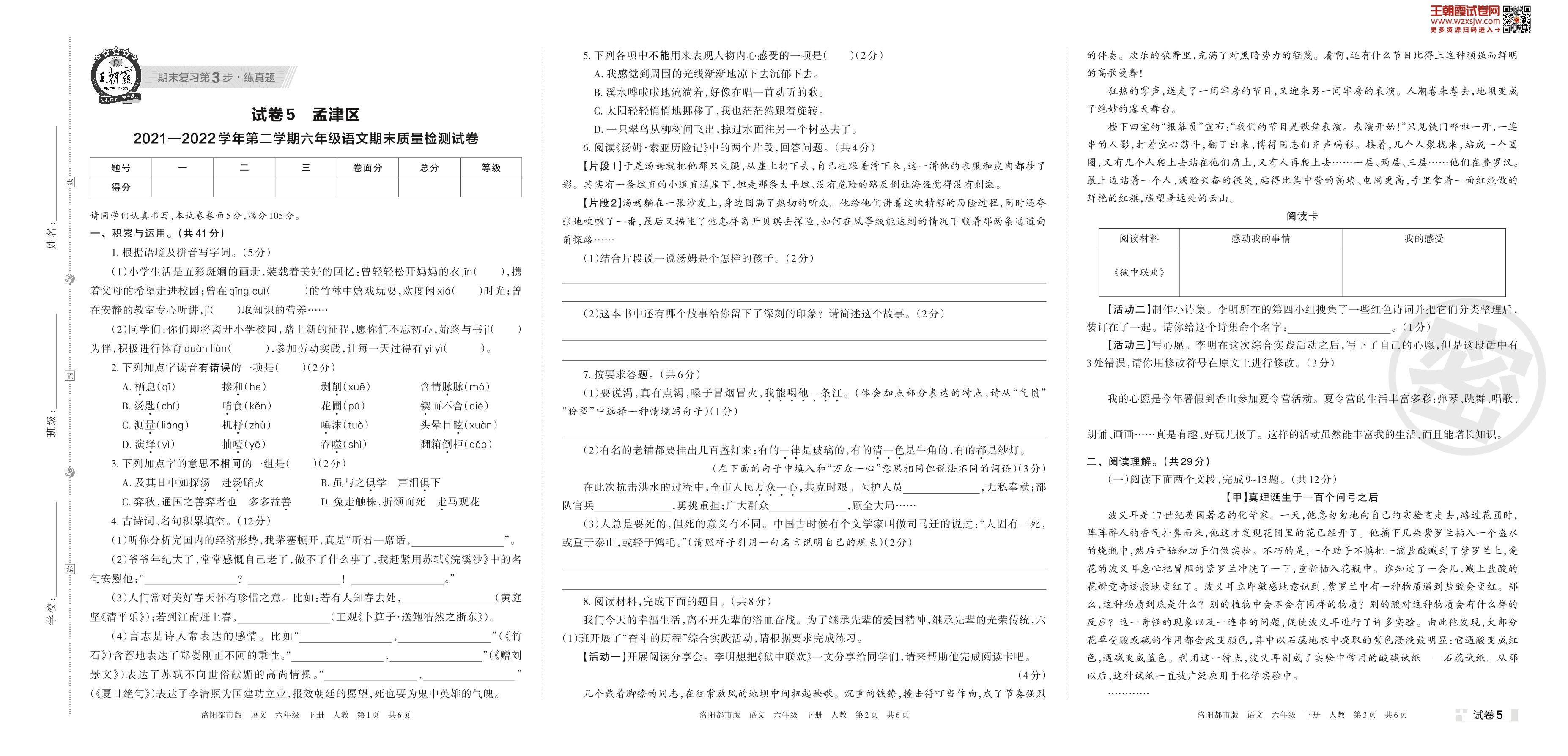 孟津区2021—2022学年第二学期六年级语文期末质量检测试卷(人教版)【5】