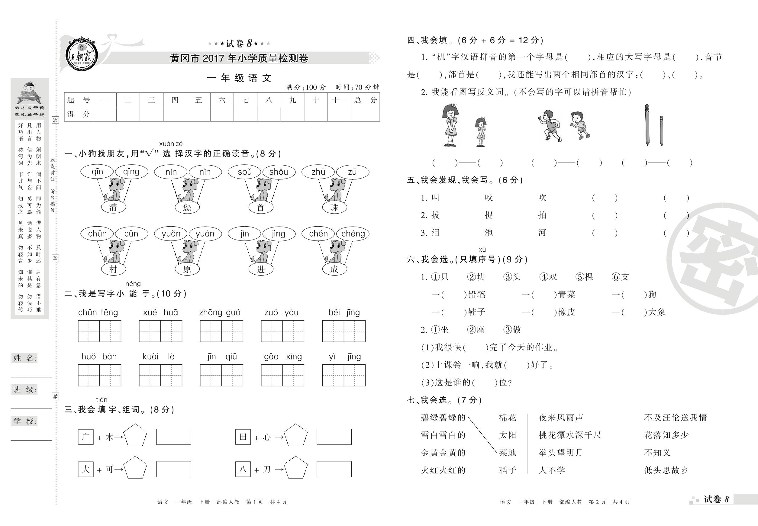 2016-2017学年第二学期黄冈市一年级语文试卷(人教版)【8】