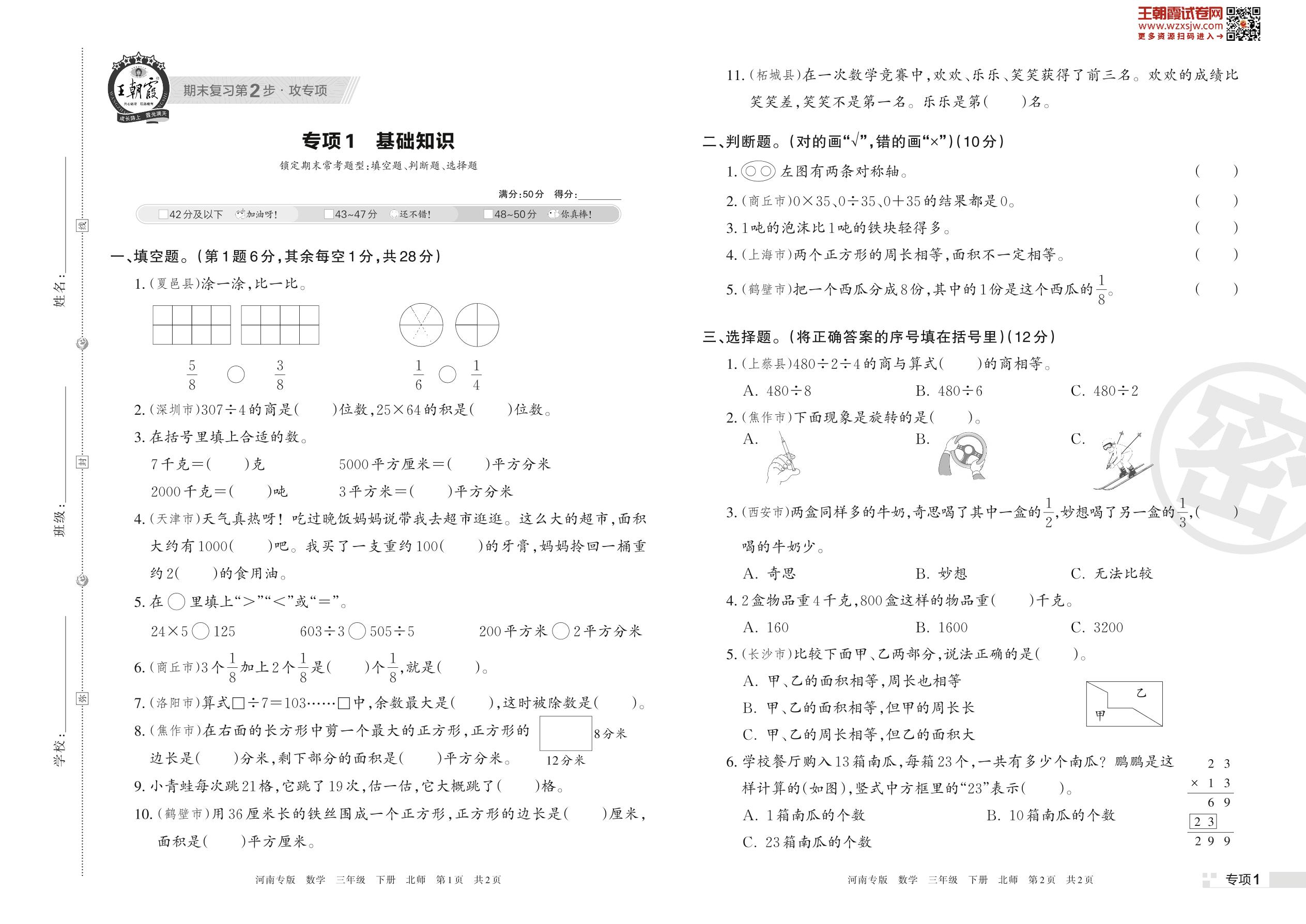 王朝霞期末专项卷——基础知识三年级下册数学(北师版)_R230425155832622【1】