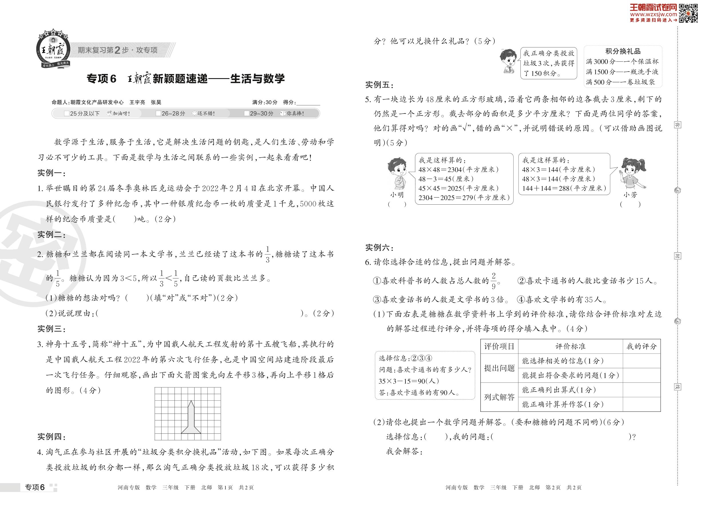 王朝霞期末专项卷——新颖题速递:生活与数学三年级下册数学(北师版)_R230425155832774【6】