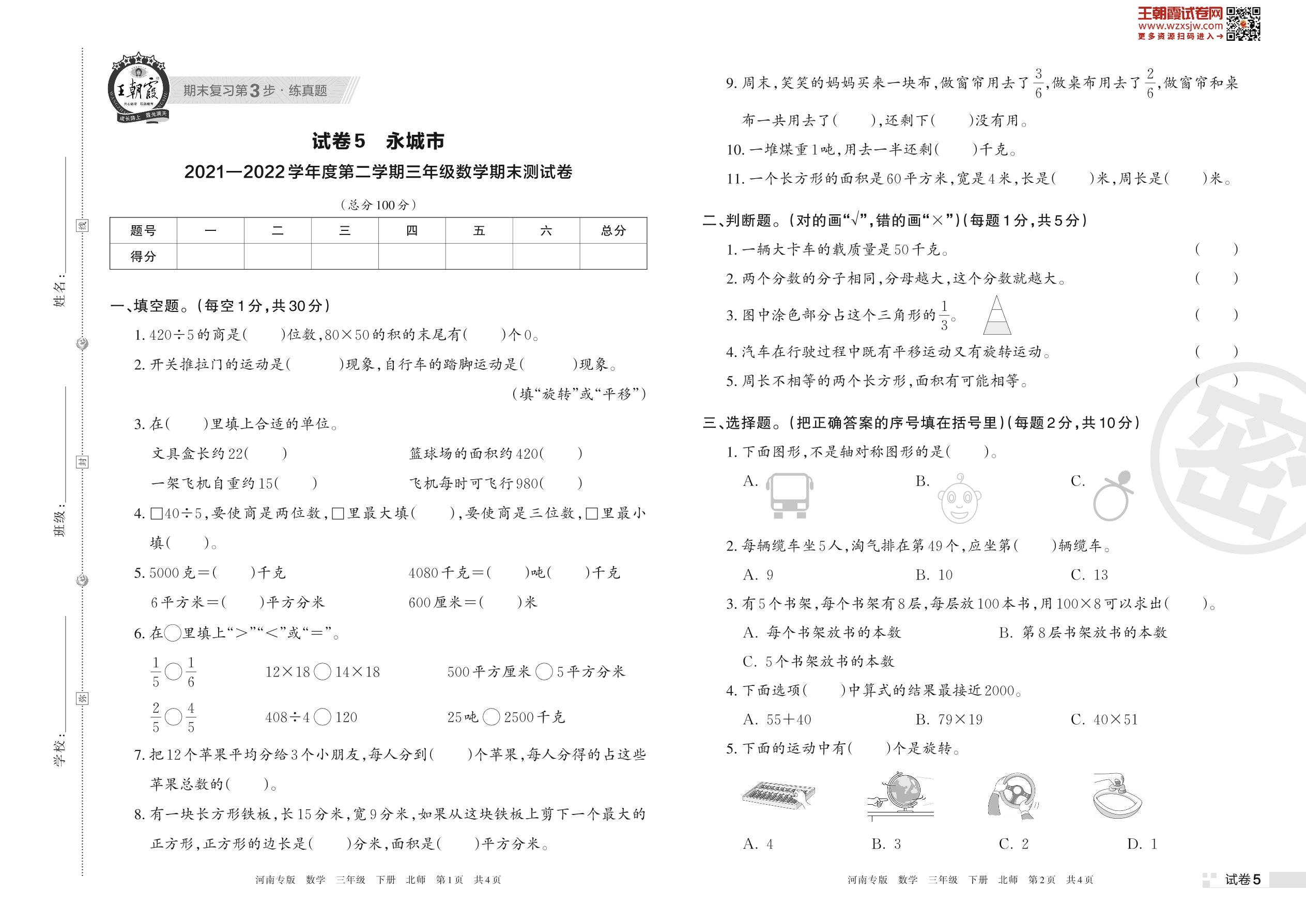 永城市2021—2022学年度第二学期三年级数学期末测试卷(北师版)【5】