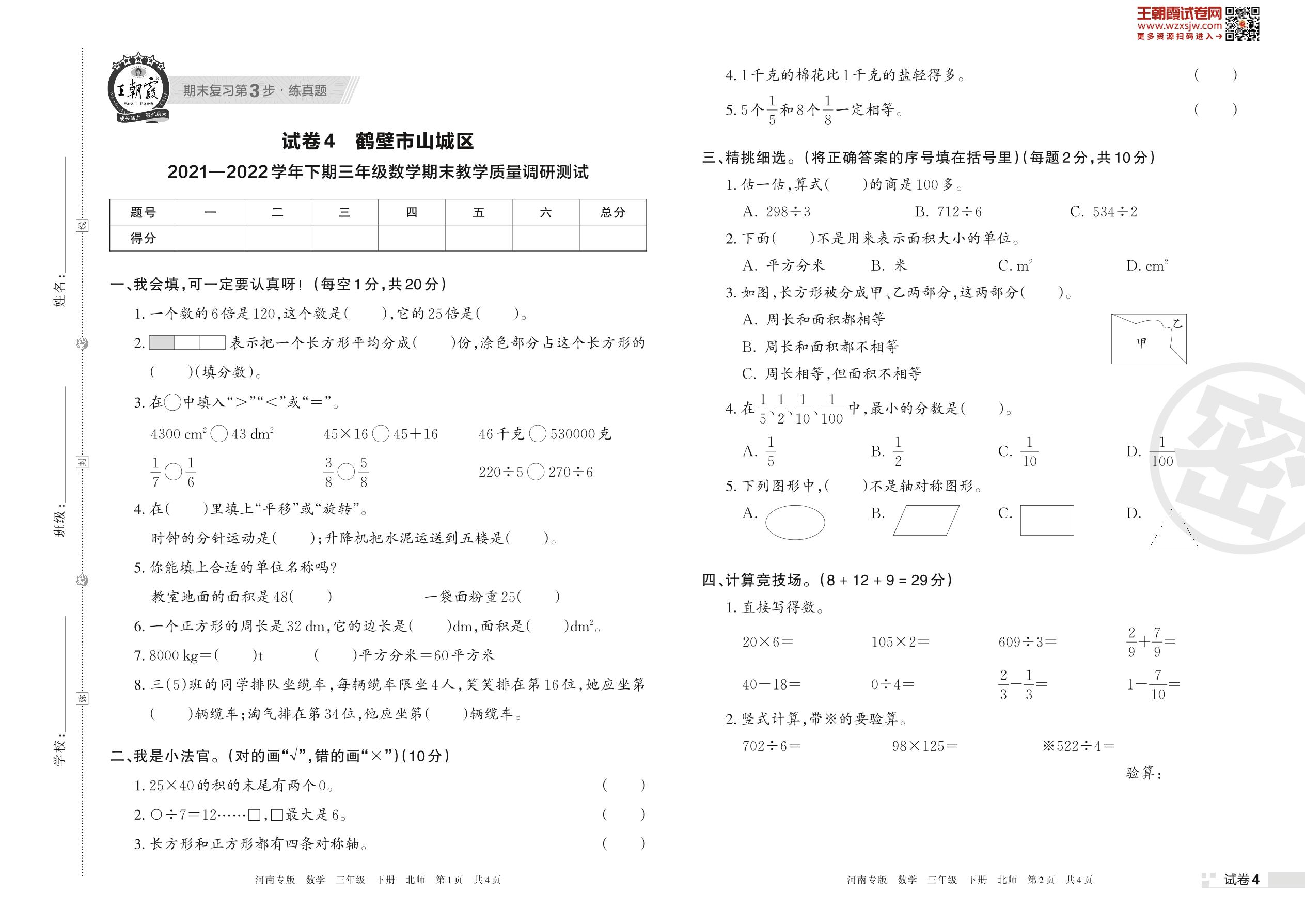 鹤壁市山城区2021—2022学年下期三年级数学期末教学质量调研测试(北师版)【4】