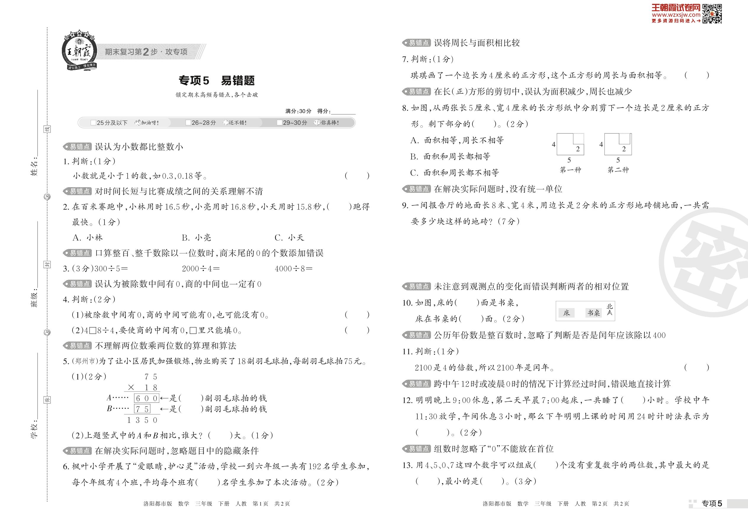 王朝霞期末专项卷——易错题三年级下册数学(人教版)_R230425162333298【5】