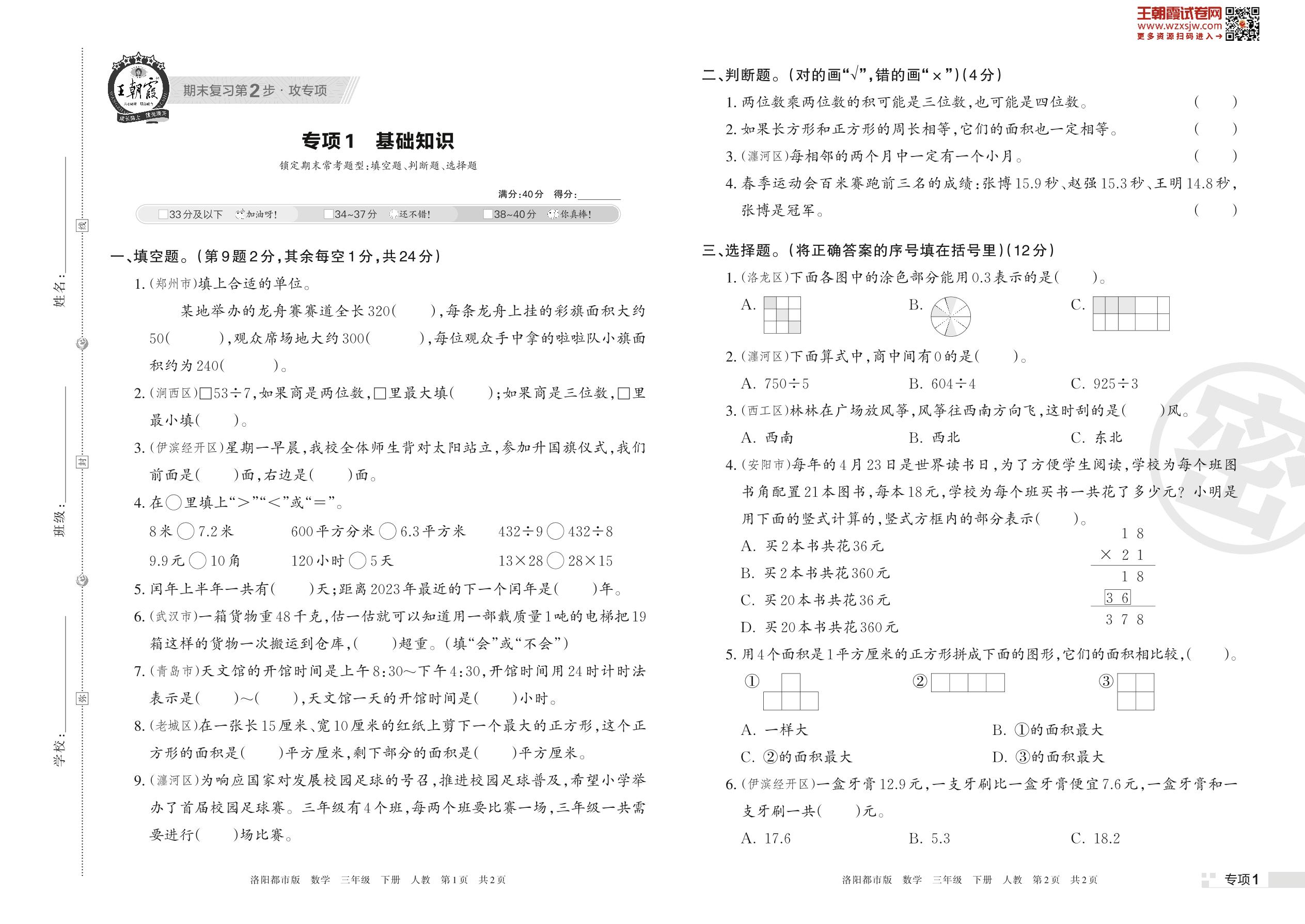 王朝霞期末专项卷——基础知识三年级下册数学(人教版)_R230425162333946【1】