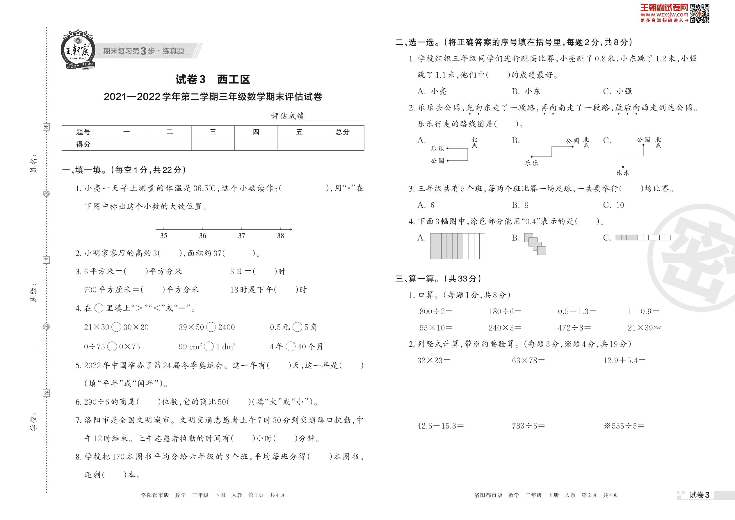 西工区2021—2022学年第二学期三年级数学期末评估试卷(人教版)【3】
