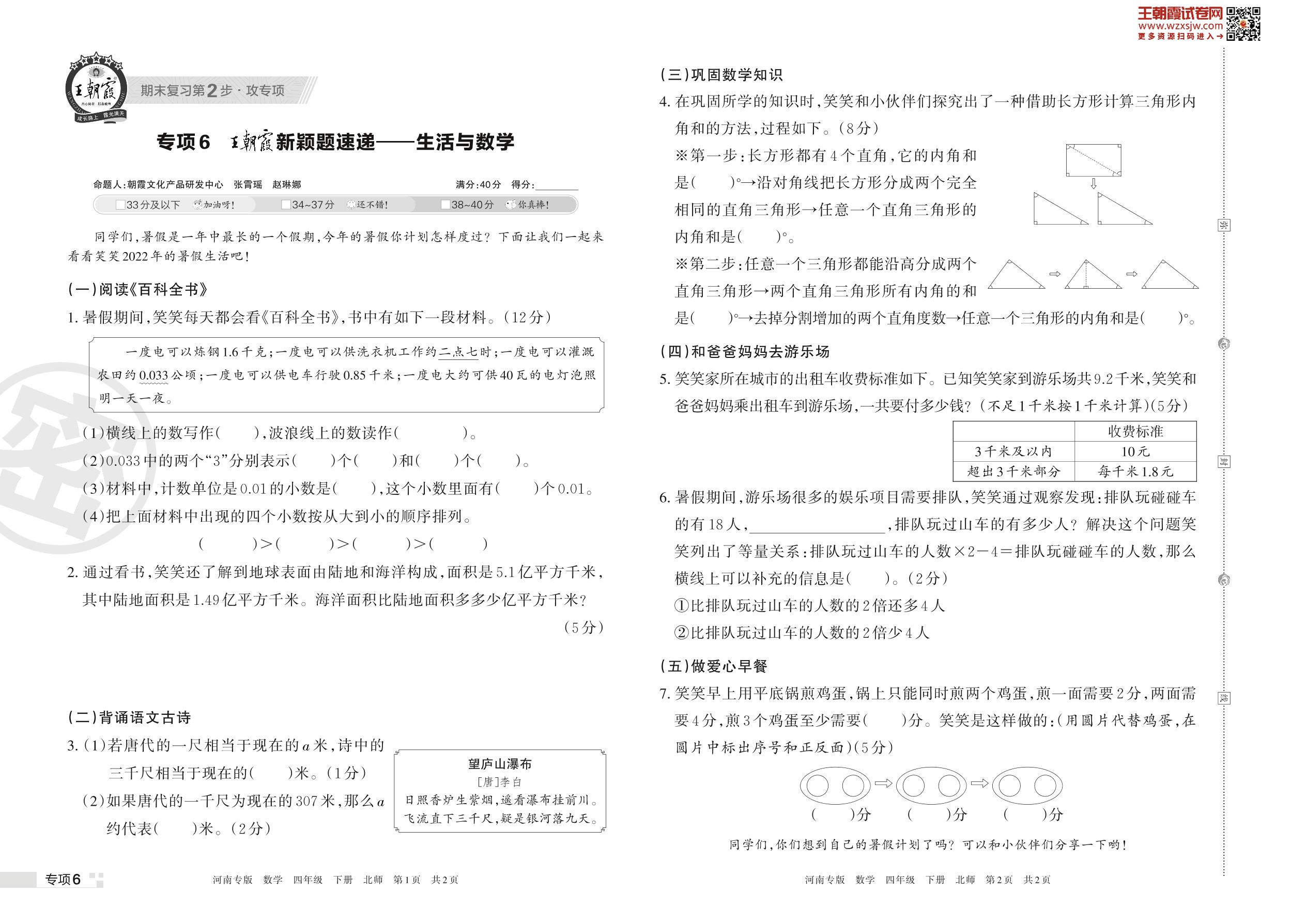 王朝霞期末专项卷——新颖题速递:生活与数学四年级下册数学(北师版)_R230425162853626【6】