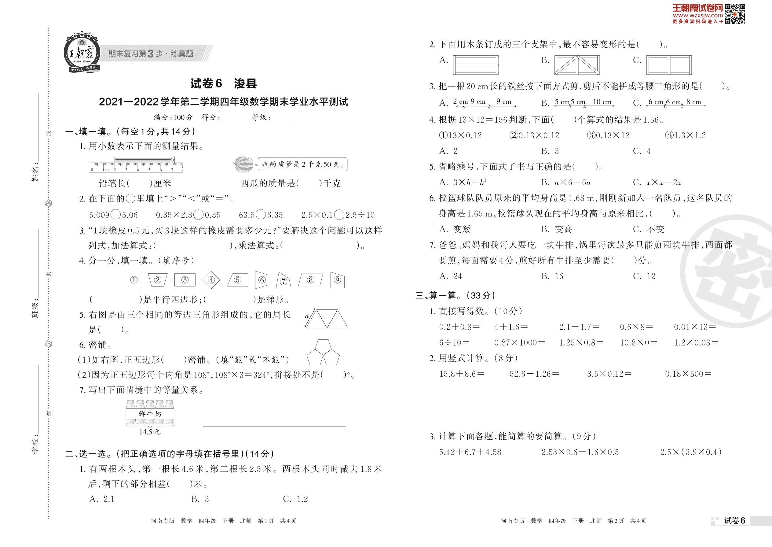 浚县2021—2022学年第二学期四年级数学期末学业水平测试(北师版)【6】