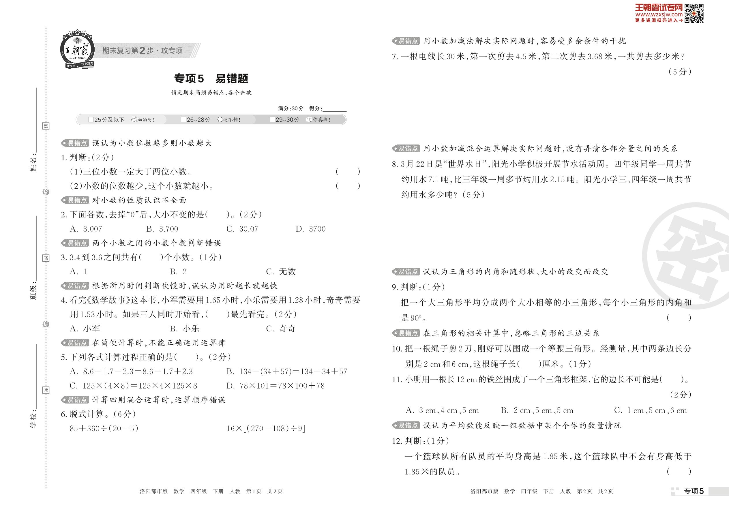 王朝霞期末专项卷——易错题四年级下册数学(人教版)_R230425162929737【5】