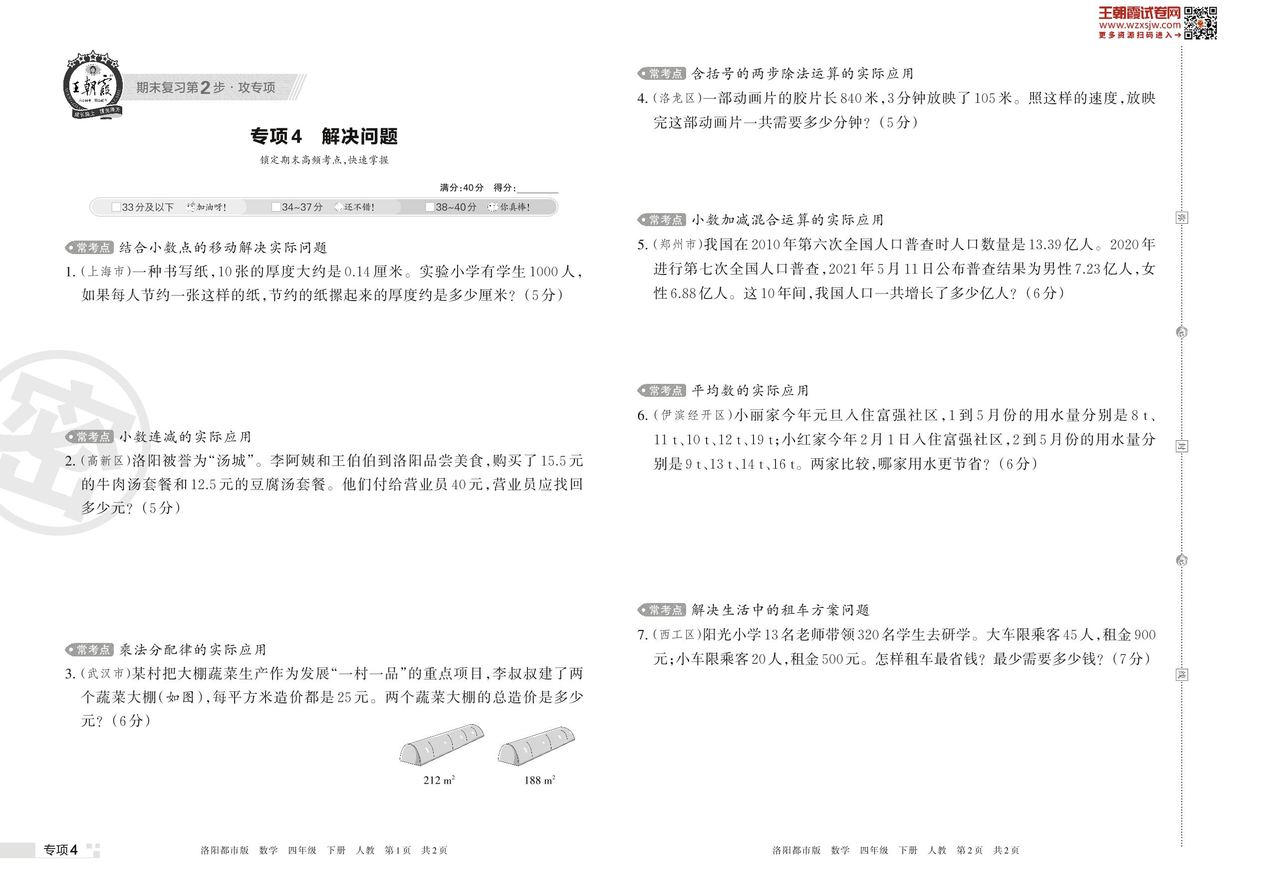 王朝霞期末专项卷——解决问题四年级下册数学(人教版)_R230425162929091【4】