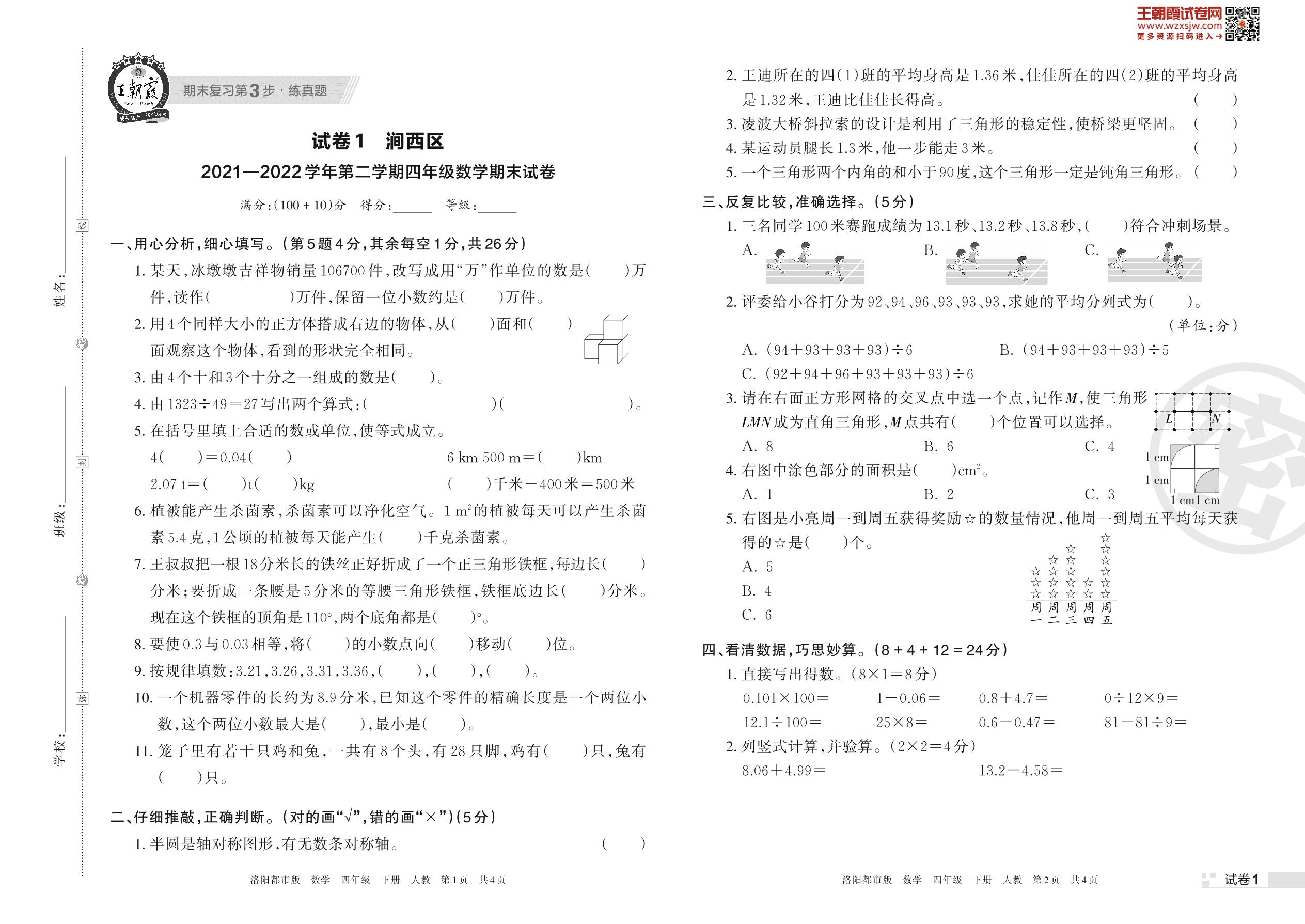 涧西区2021—2022学年第二学期四年级数学期末试卷(人教版)【1】