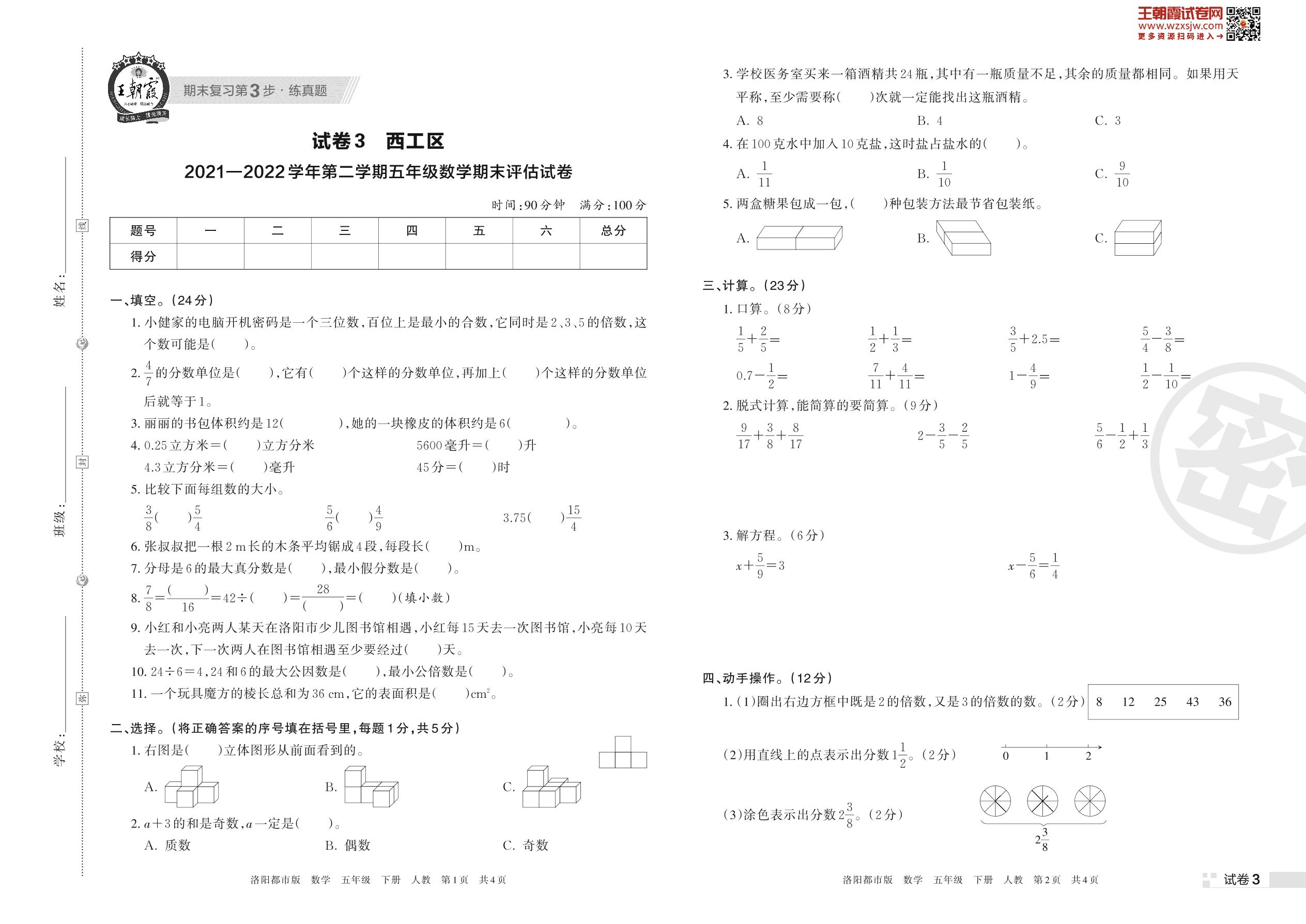 西工区2021—2022学年第二学期五年级数学期末评估试卷(人教版)【3】