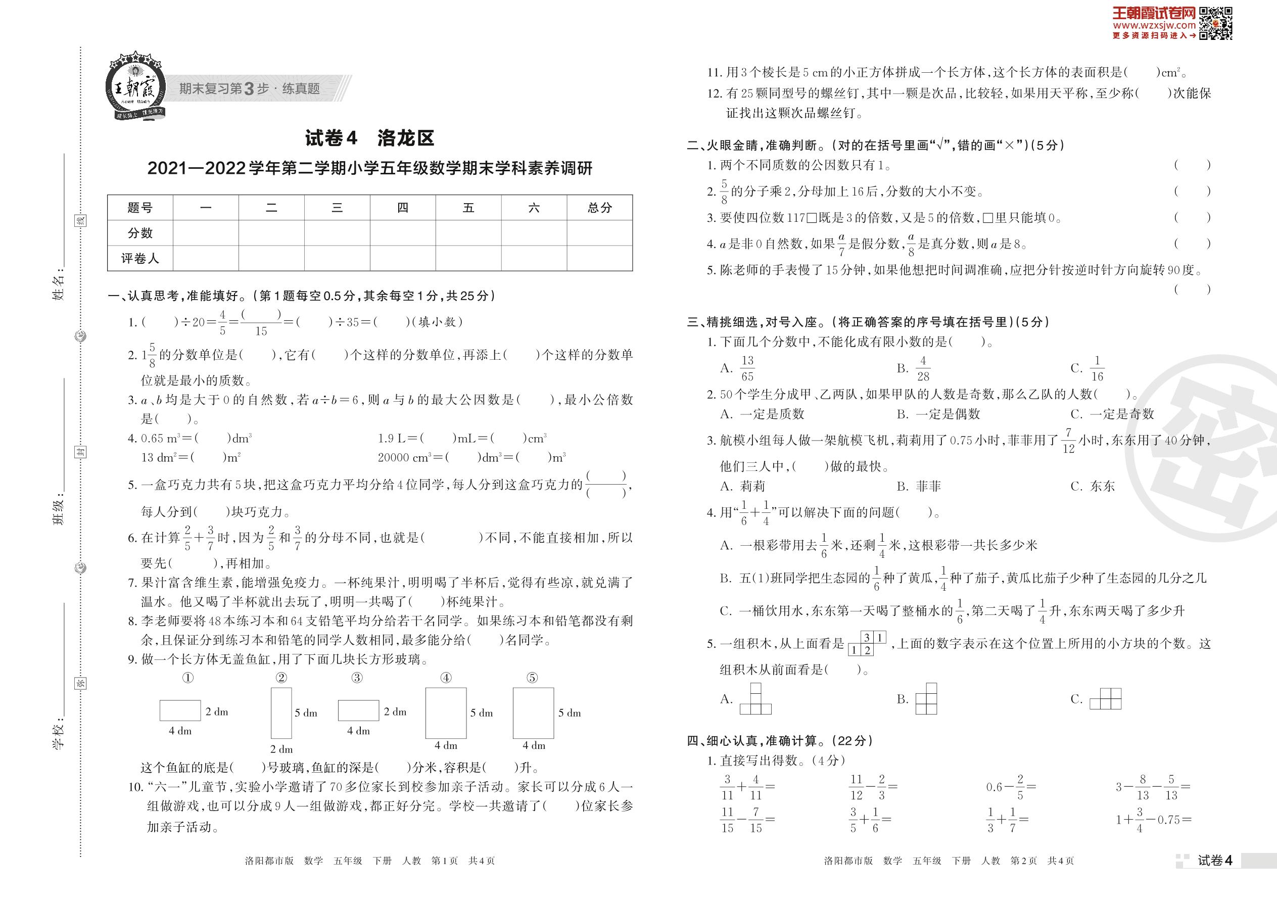 洛龙区2021—2022学年第二学期小学五年级数学期末学科素养调研(人教版)【4】