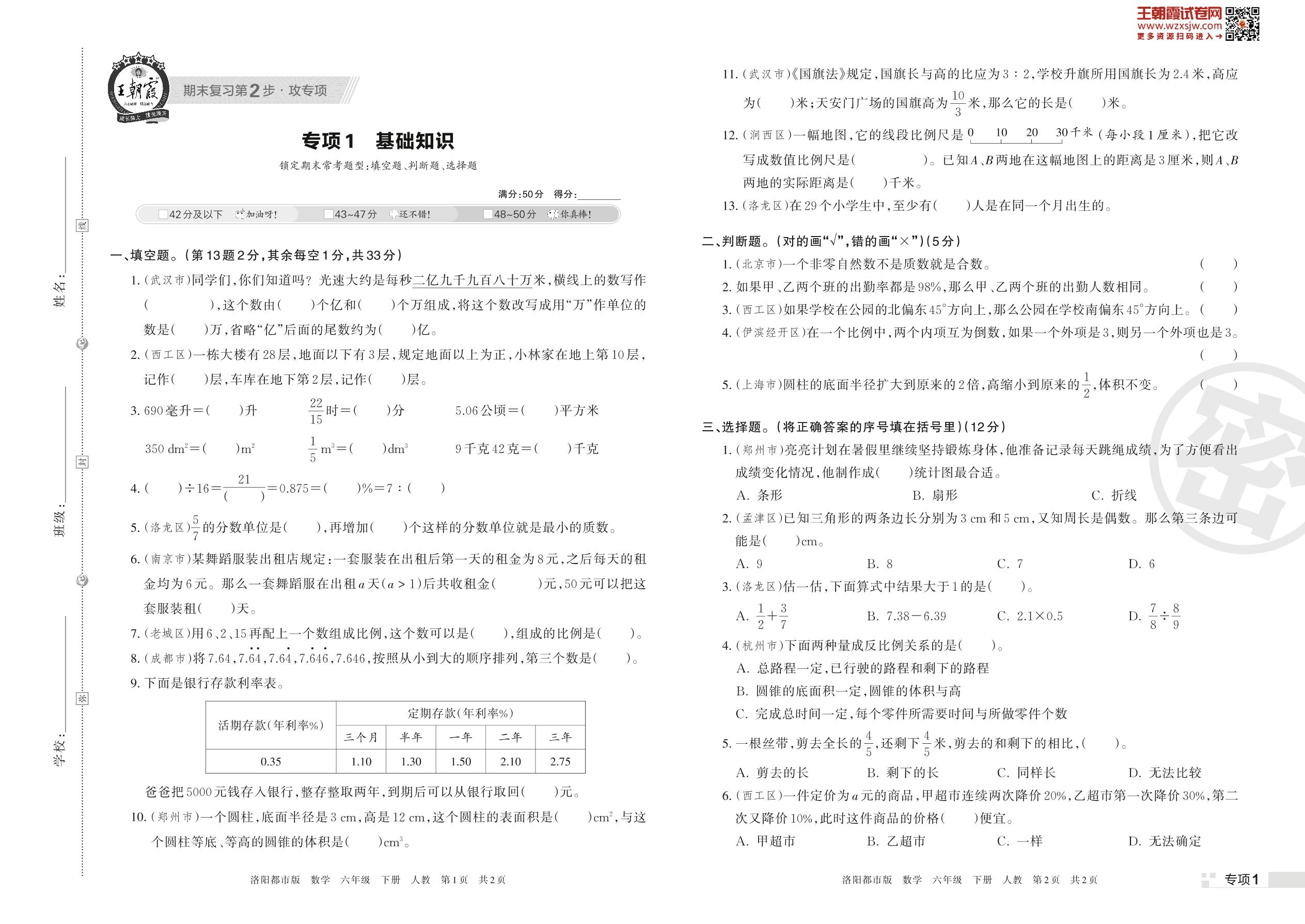 王朝霞期末专项卷——基础知识六年级下册数学(人教版)_R230425164017411【1】