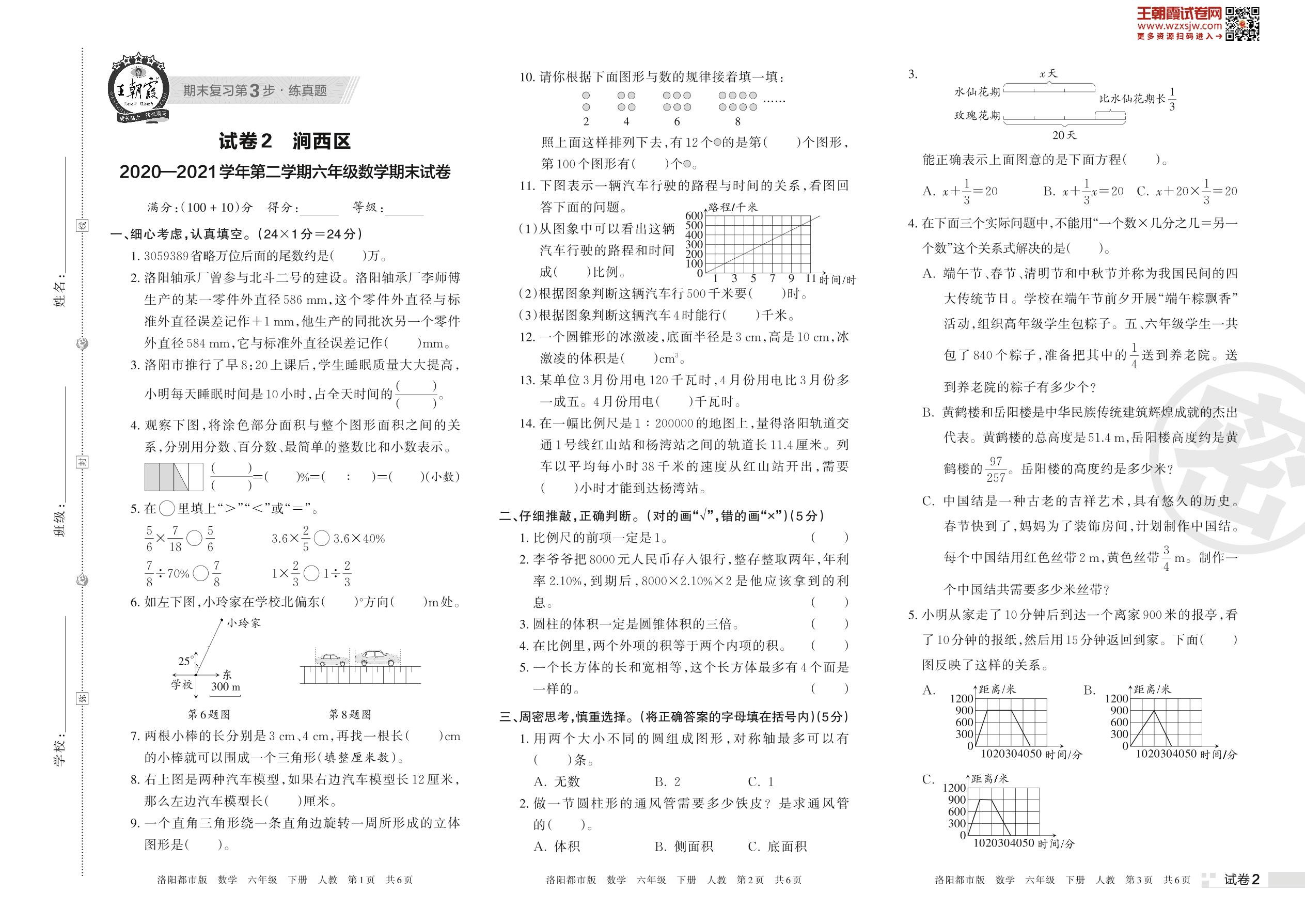 涧西区2020—2021学年第二学期六年级数学期末试卷(人教版)【2】