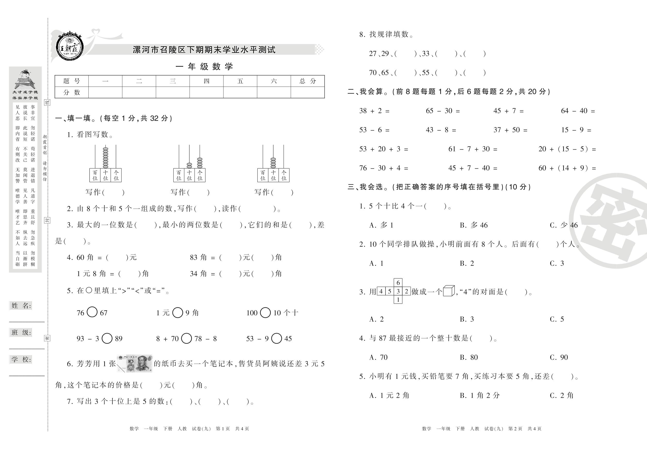 2015-2016学年第二学期漯河市召陵区一年级数学试卷(人教版)【9】