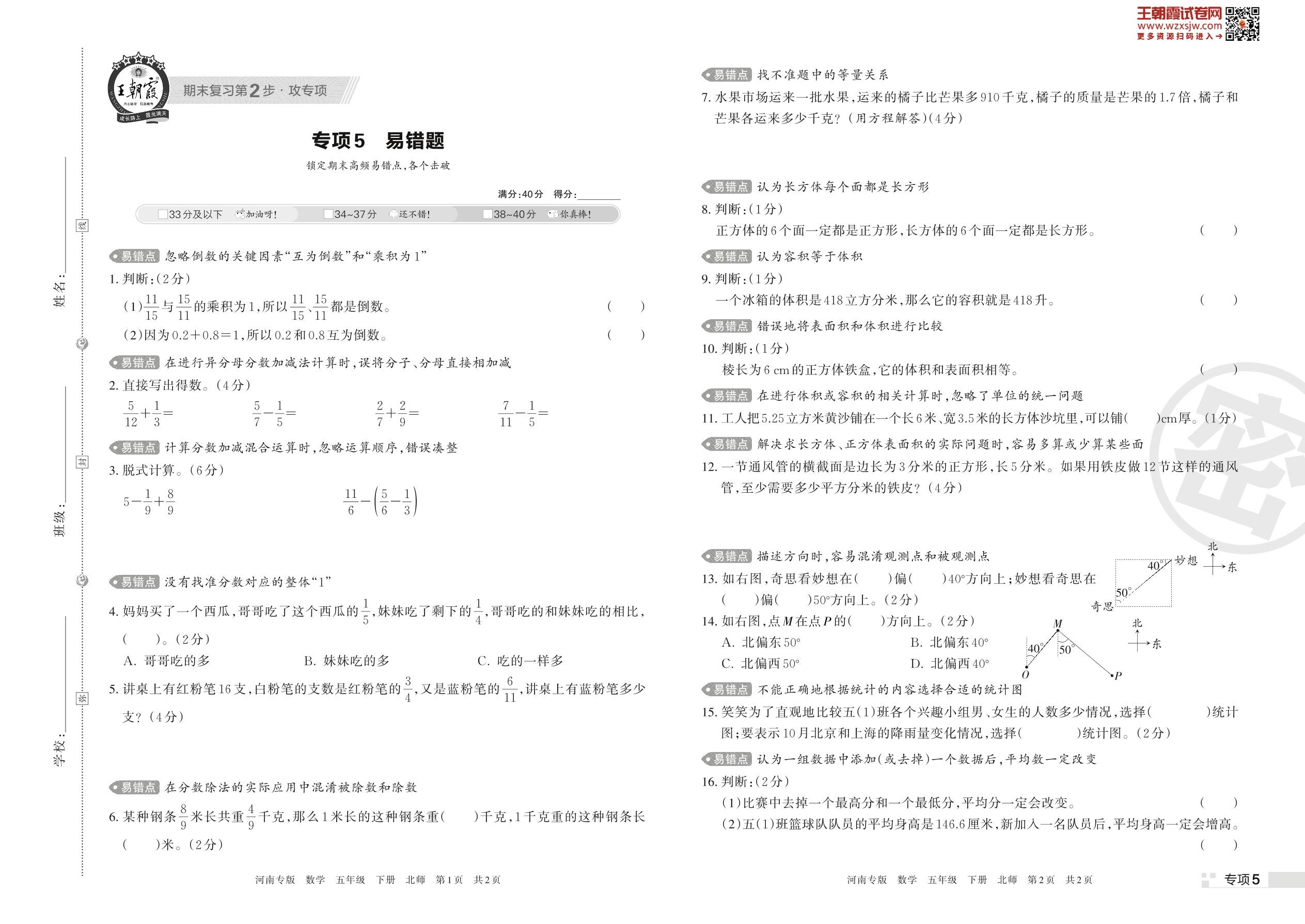 王朝霞期末专项卷——易错题五年级下册数学(北师版)_R230425164110546【5】