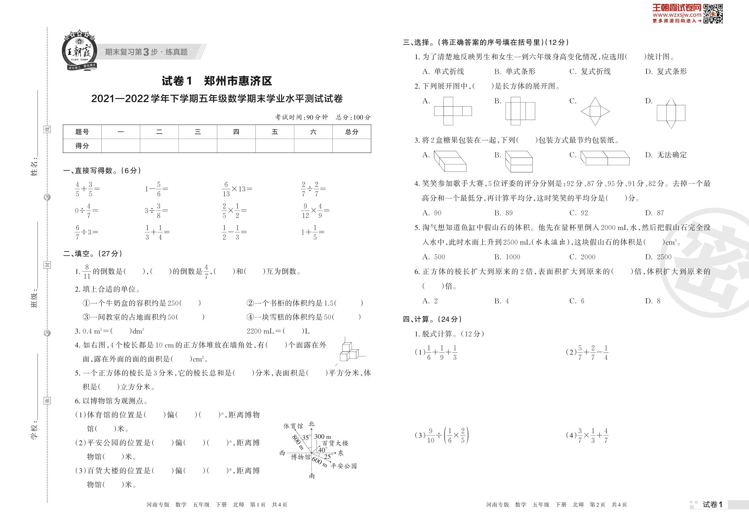 郑州市惠济区2021—2022学年下学期五年级数学期末学业水平测试试卷(北师版)【1】