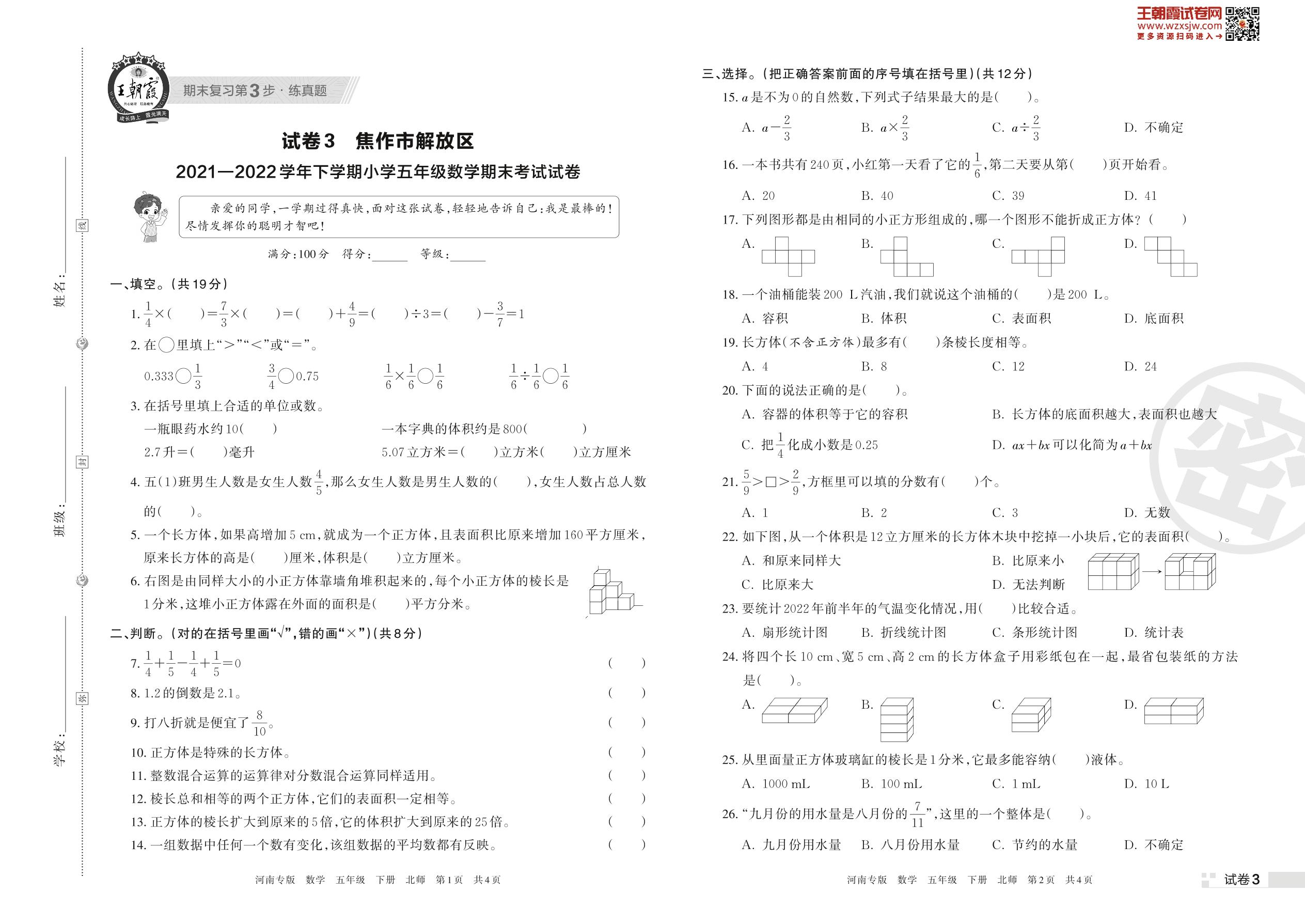 焦作市解放区2021—2022学年下学期小学五年级数学期末考试试卷(北师版)【3】