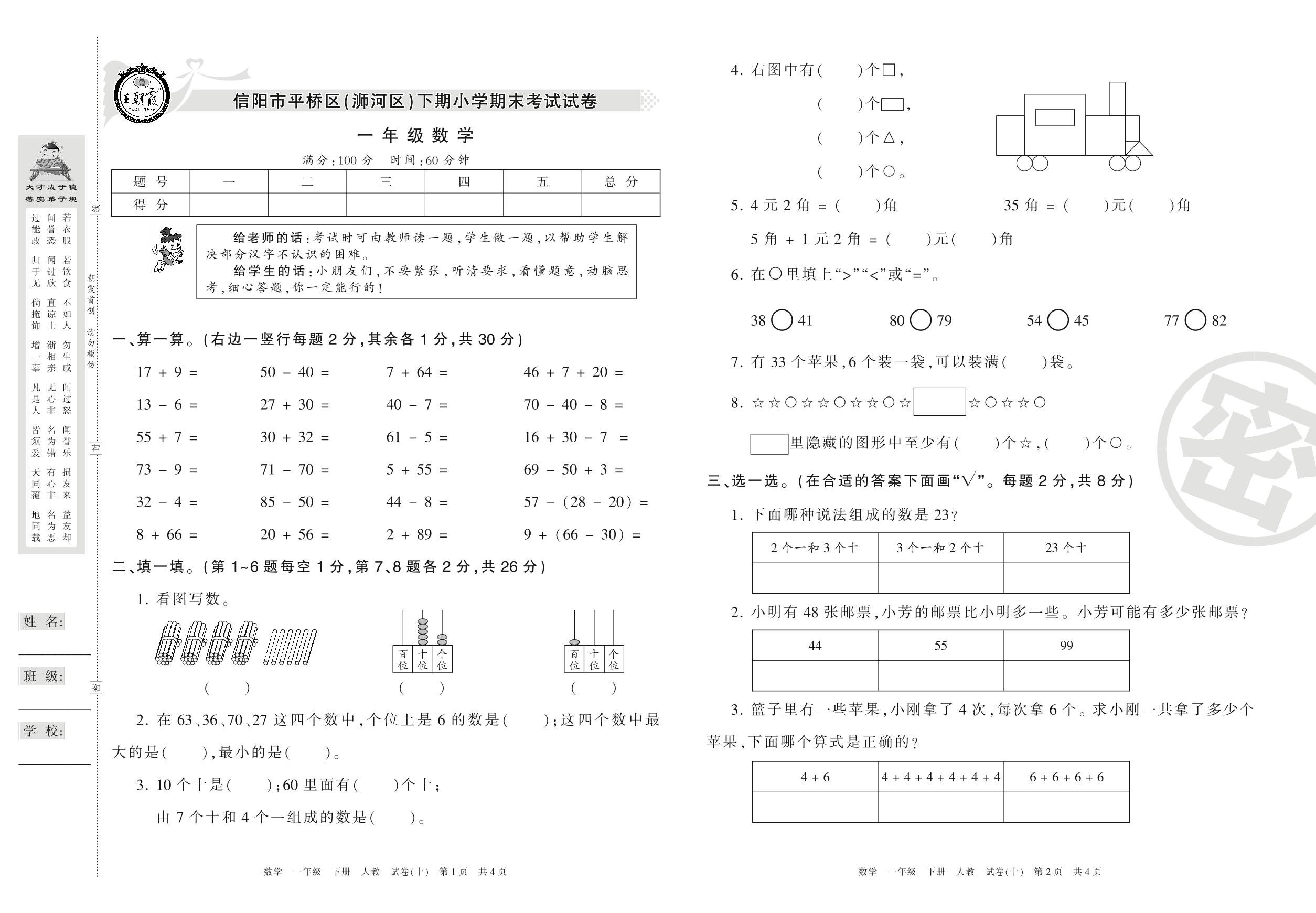 2015-2016学年第二学期信阳市平桥区(浉河区)一年级数学试卷(人教版)【10】