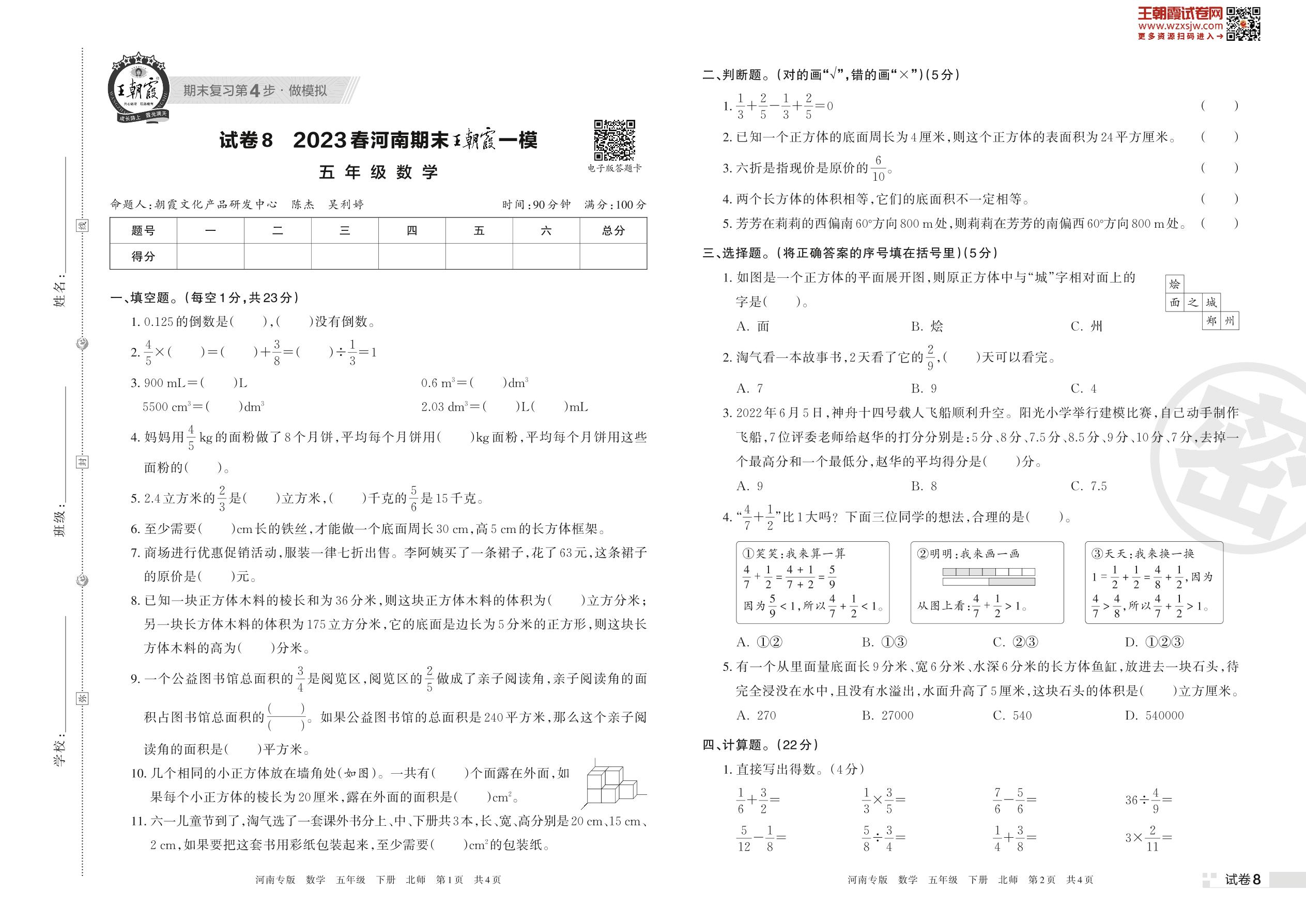王朝霞期末模拟卷五年级下册数学(北师版)_R230425164111529【8】