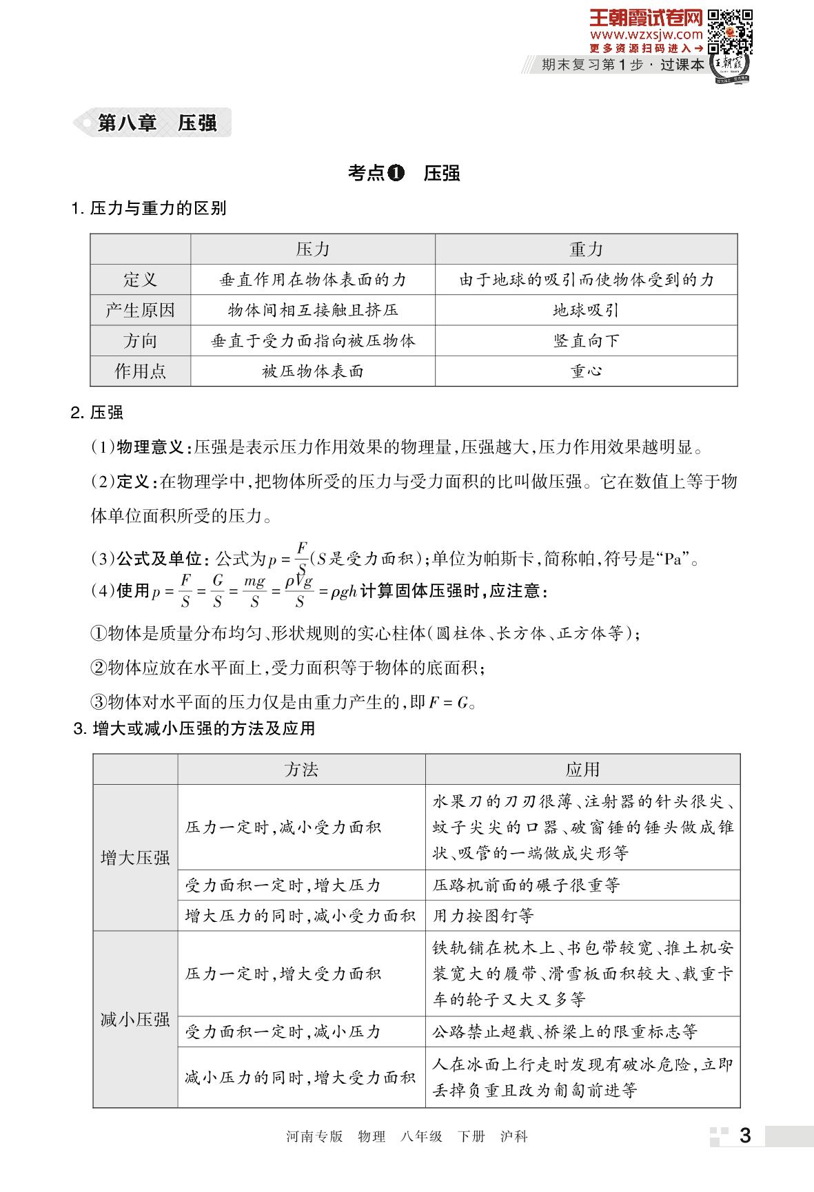 王朝霞期末知识梳理——第八章 压强八年级下册物理(沪科版)_R230425165800732