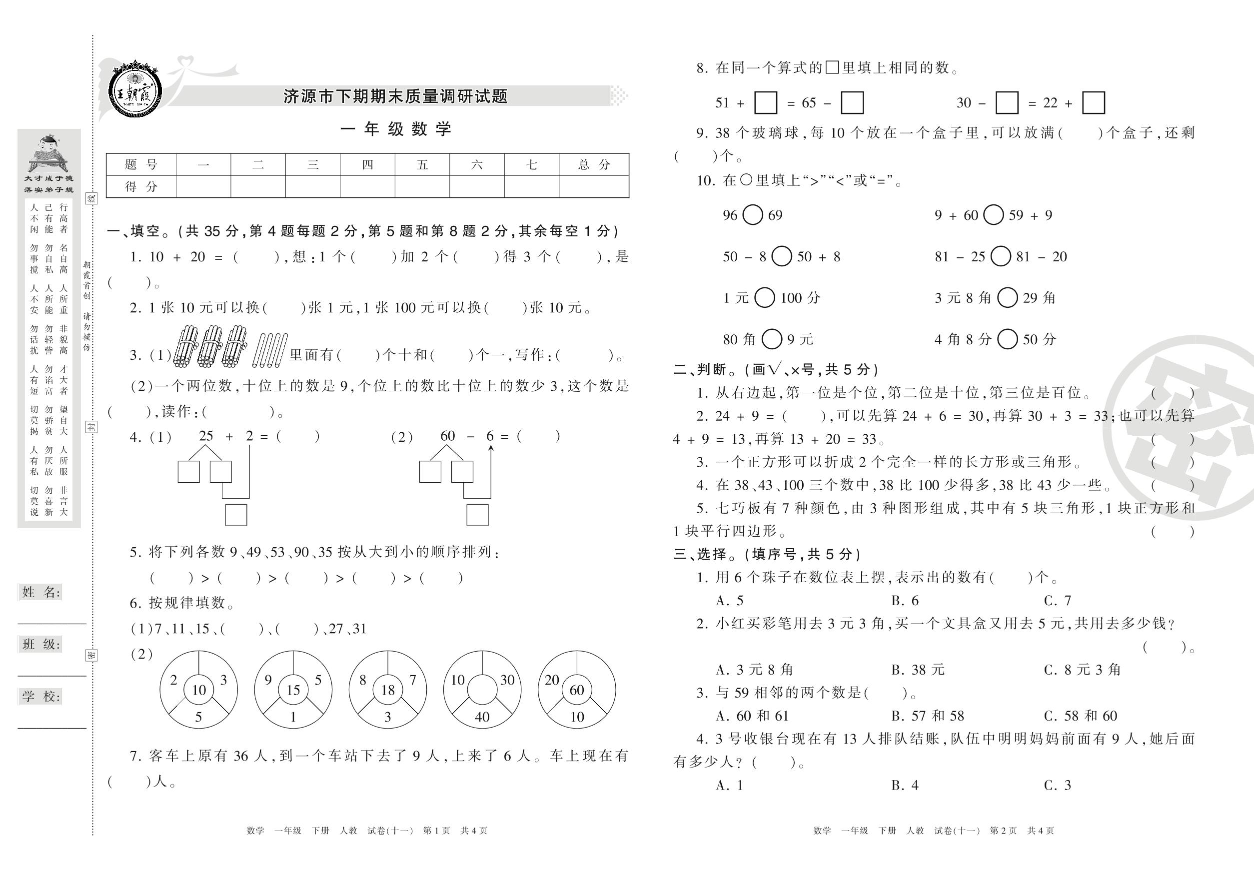 2015-2016学年第二学期济源市一年级数学试卷(人教版)【11】