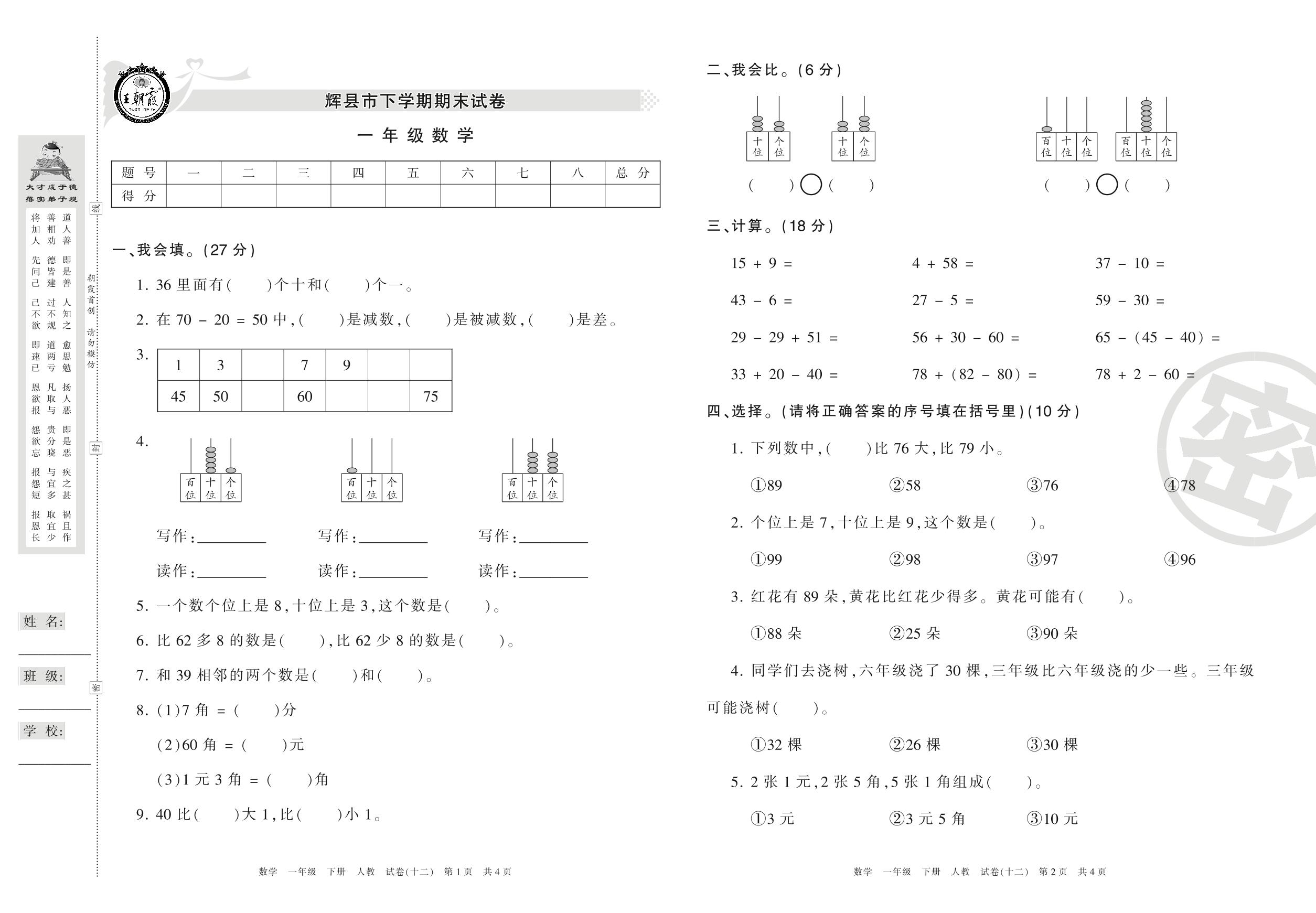 2015-2016学年第二学期辉县市一年级数学试卷(人教版)【12】