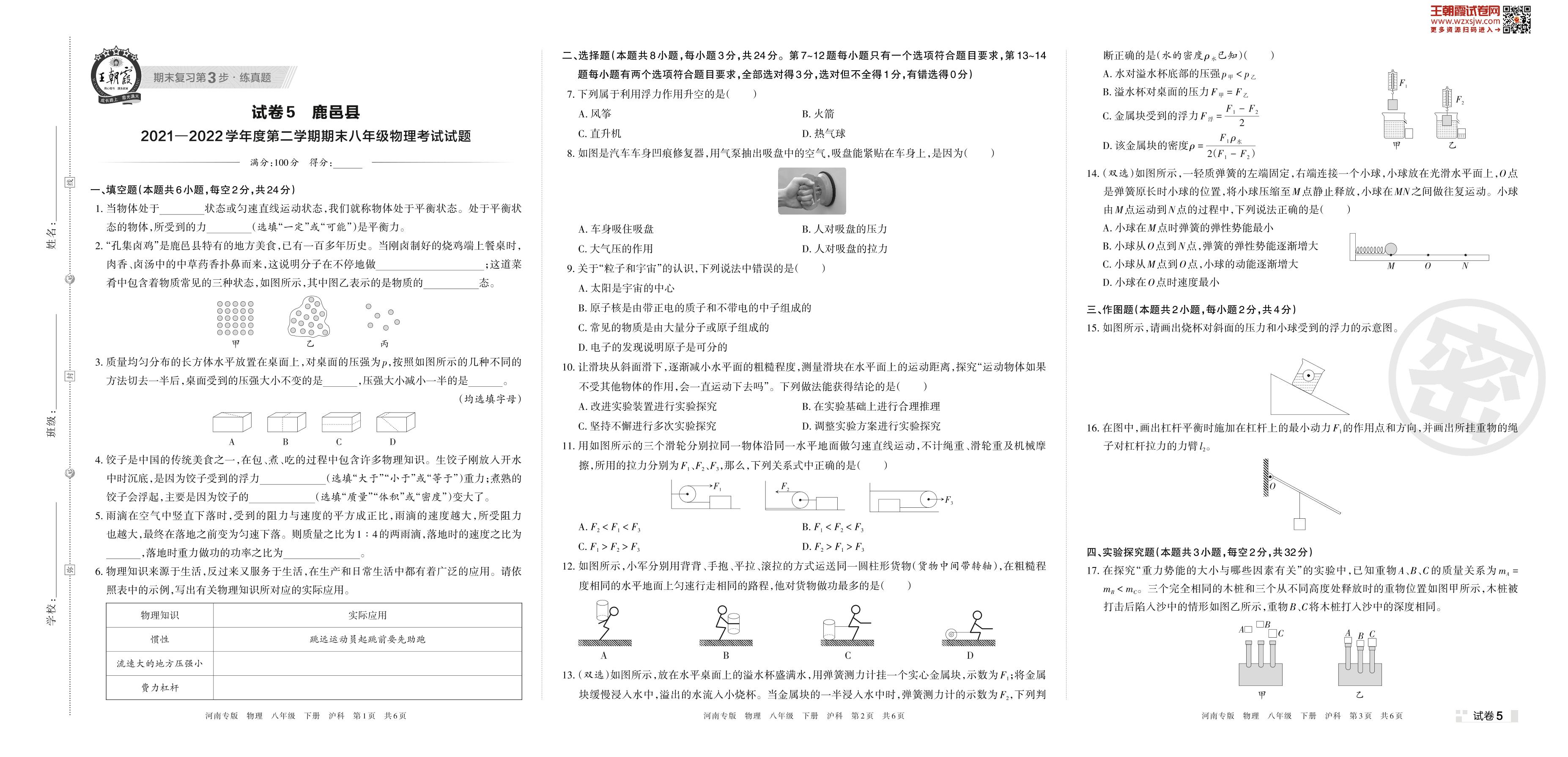鹿邑县2021—2022学年度第二学期期末八年级物理考试试题(沪科版)【5】