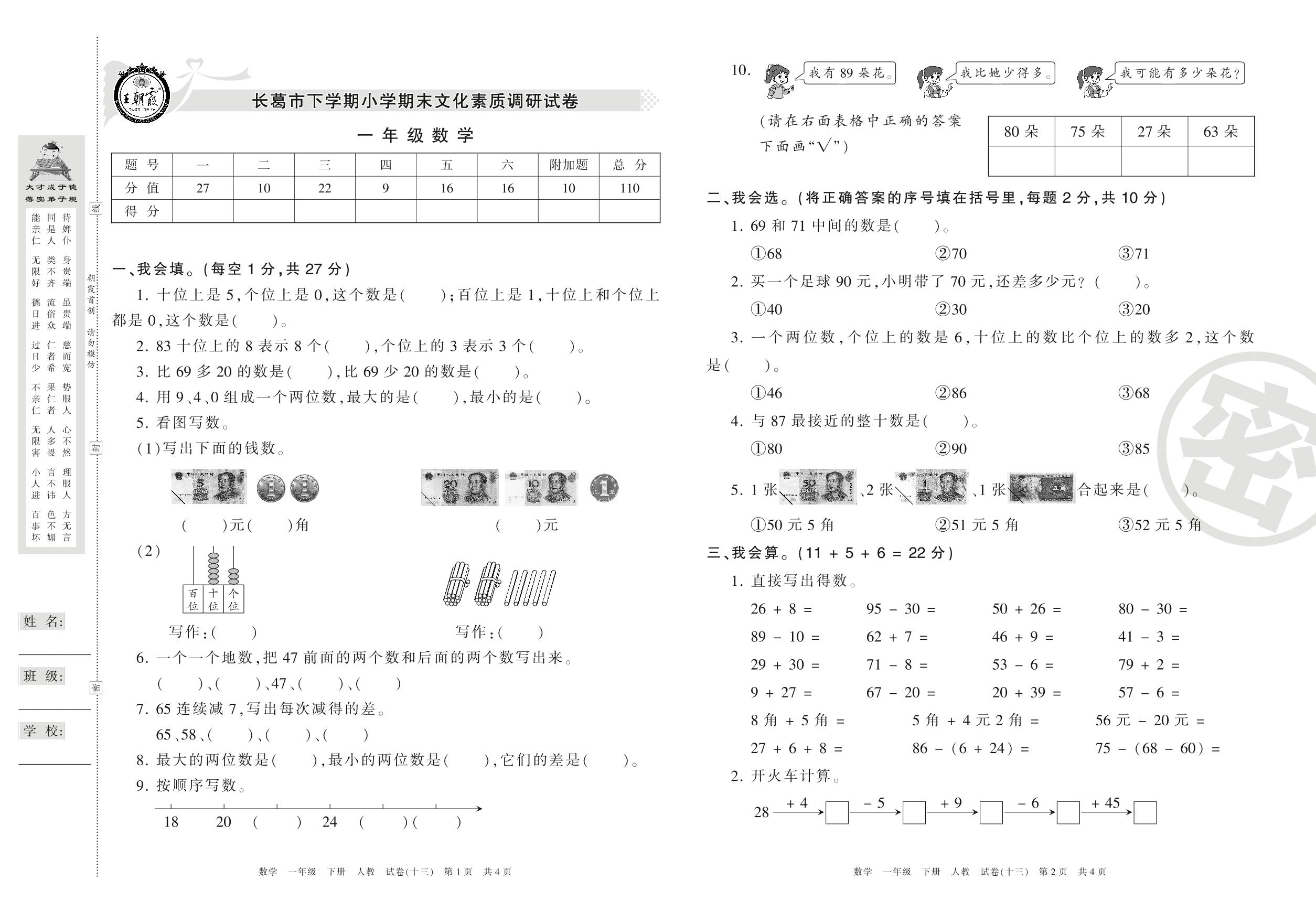 2015-2016学年第二学期长葛市一年级数学试卷(人教版)【13】