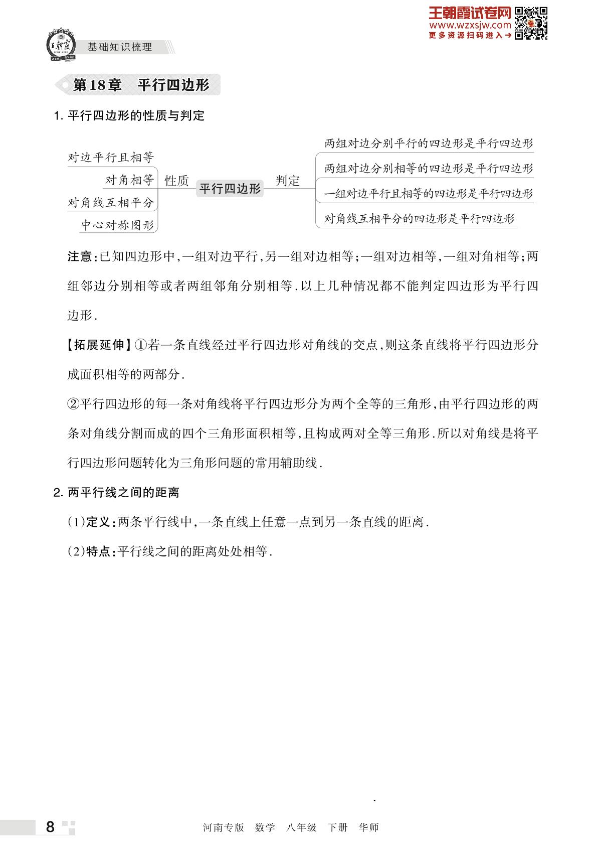 王朝霞期末知识梳理——第18章 平行四边形八年级下册数学(华师版)