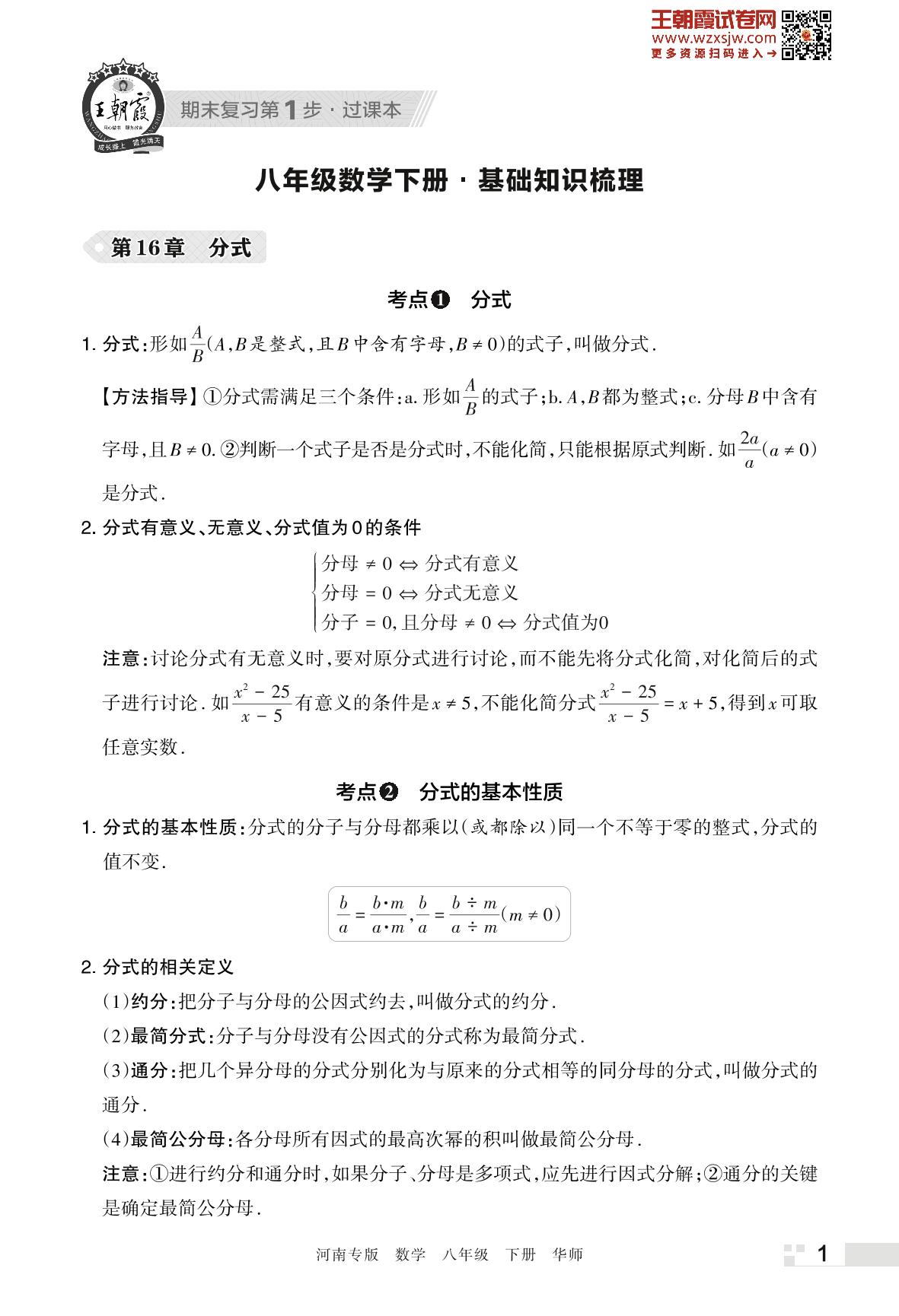 王朝霞期末知识梳理——第16章 分式八年级下册数学(华师版)