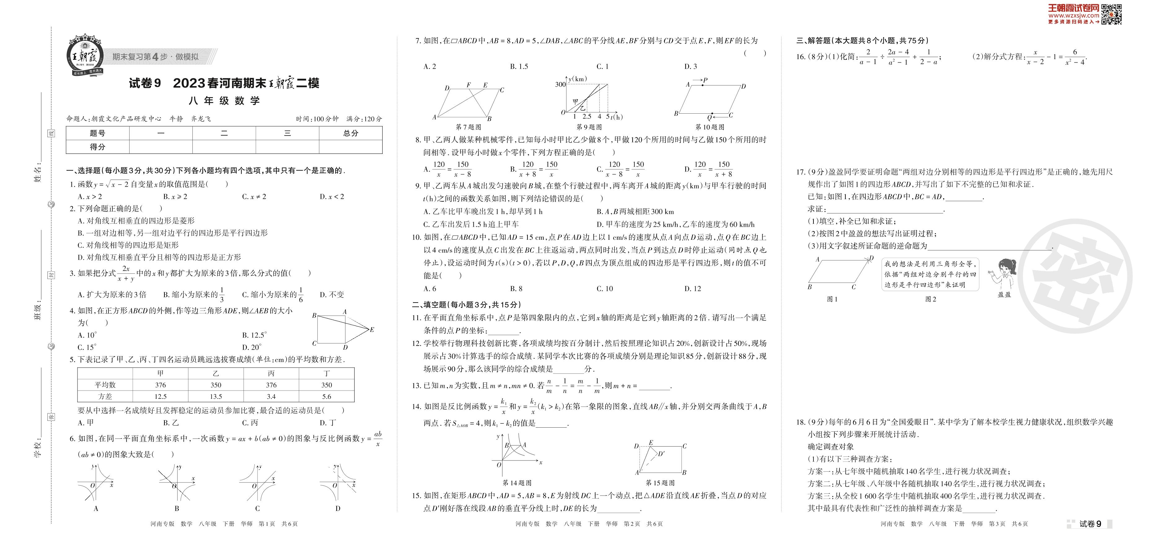 王朝霞期末模拟卷八年级下册数学(华师版)【9】