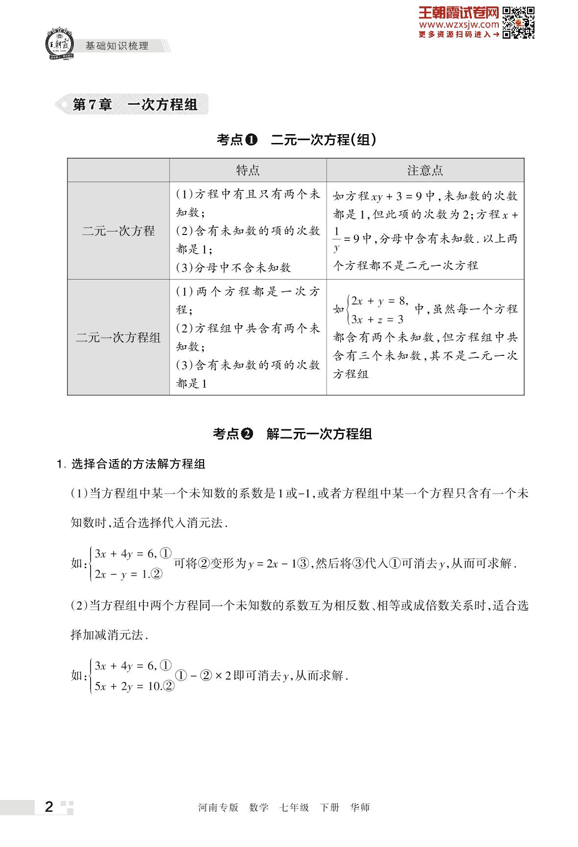王朝霞期末知识梳理——第7章 一次方程组七年级下册数学(华师版)