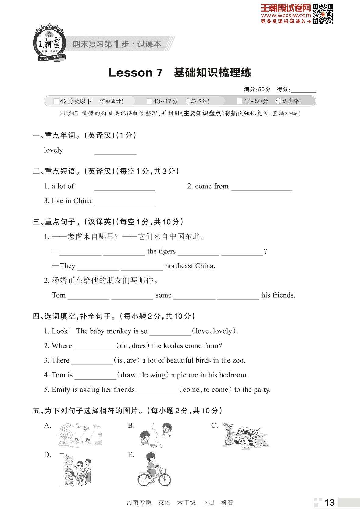 王朝霞期末过课本——Lesson 7 基础知识梳理练六年级下册英语(科普版)_R230425173402257