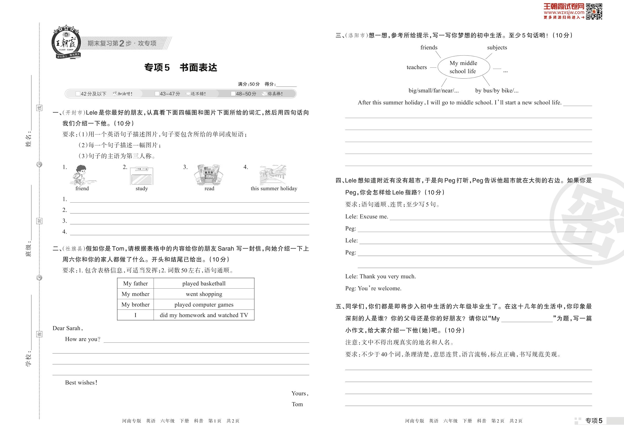王朝霞期末专项卷——书面表达六年级下册英语(科普版)_R230425173403863【5】